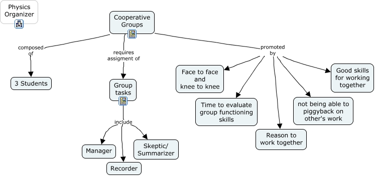 This Concept Map, created with IHMC CmapTools, has information related to: Cooperative Groups, Group tasks include Manager, Cooperative Groups requires assigment of Group tasks, Cooperative Groups composed of 3 Students, Cooperative Groups promoted by Reason to work together, Group tasks include Skeptic/ Summarizer, Cooperative Groups promoted by not being able to piggyback on other's work, Cooperative Groups promoted by Time to evaluate group functioning skills, Cooperative Groups promoted by Face to face and knee to knee, Group tasks include Recorder, Cooperative Groups promoted by Good skills for working together