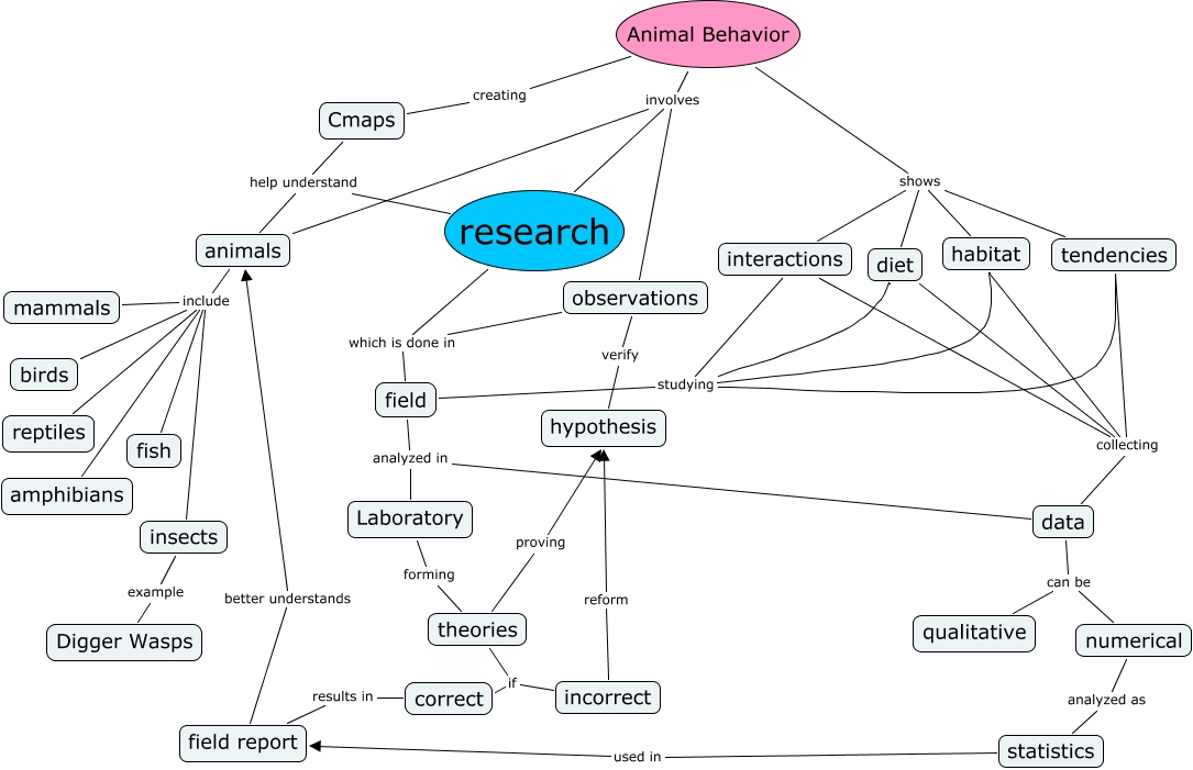 This Concept Map, created with IHMC CmapTools, has information related to: Animal Behavior jenn and ken final, Animal Behavior involves research, numerical analyzed as statistics, diet collecting tendencies, field studying interactions, data analyzed in Laboratory, data can be numerical, correct results in field report, Animal Behavior involves animals, animals include reptiles, data can be qualitative, Animal Behavior shows habitat, Laboratory forming theories, Cmaps help understand animals, diet collecting interactions, field report better understands animals, Animal Behavior shows interactions, animals include fish, theories proving hypothesis, statistics used in field report, research which is done in field
