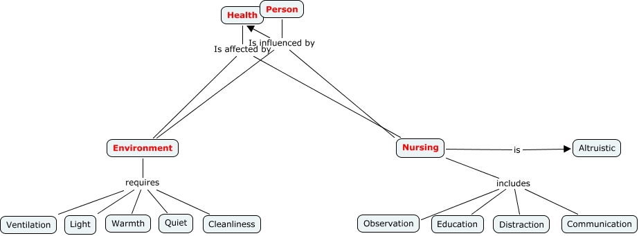 This Concept Map, created with IHMC CmapTools, has information related to: Nightingale Concept Map, Health Is affected by Nursing, Health Is affected by Environment, Person Is influenced by Health, Environment requires Quiet, Nursing includes Observation, Nursing includes Communication, Nursing includes Distraction, Environment requires Ventilation, Nursing is Altruistic, Nursing includes Education, Environment requires Light, Person Is influenced by Environment, Person Is influenced by Nursing, Environment requires Cleanliness, Environment requires Warmth