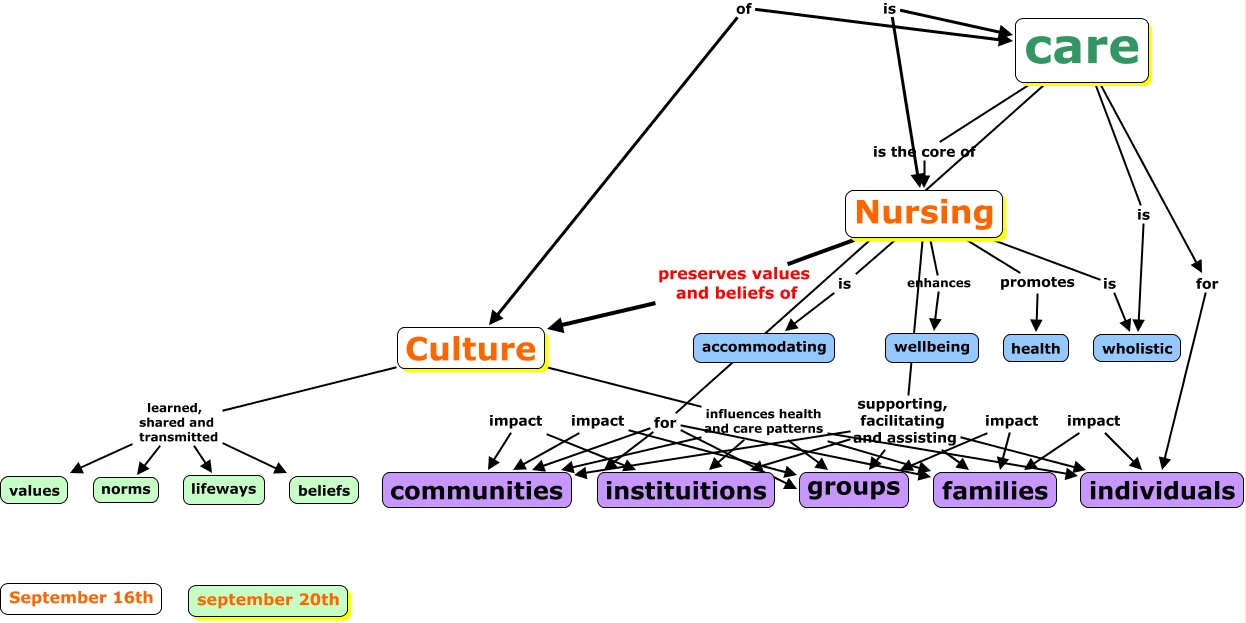 Este Cmap, tiene información relacionada con: M. Leininger~Concept Map, Nursing supporting, facilitating and assisting instituitions, care is wholistic, Culture learned, shared and transmitted beliefs, Culture influences health and care patterns individuals, care for communities, Nursing supporting, facilitating and assisting groups, care for individuals, Nursing preserves values and beliefs of Culture, Culture learned, shared and transmitted values, Culture influences health and care patterns communities, Culture influences health and care patterns instituitions, Culture influences health and care patterns groups, care for groups, Culture learned, shared and transmitted norms, Culture influences health and care patterns families, care for instituitions, Nursing promotes health, Culture learned, shared and transmitted lifeways, care is the core of Nursing, Nursing is accommodating