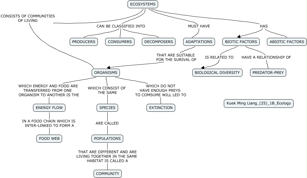 This Concept Map, created with IHMC CmapTools, has information related to: Kuek Ming Liang_(25)_1B Ecology, ECOSYSTEMS HAS BIOTIC FACTORS, ORGANISMS WHICH CONSIST OF THE SAME SPECIES, POPULATIONS THAT ARE DIFFERENT AND ARE LIVING TOGETHER IN THE SAME HABITAT IS CALLED A COMMUNITY, BIOTIC FACTORS IS RELATED TO BIOLOGICAL DIVERSITY, ADAPTATIONS THAT ARE SUITABLE FOR THE SURIVAL OF ORGANISMS, ECOSYSTEMS HAS ABIOTIC FACTORS, SPECIES ARE CALLED POPULATIONS, ECOSYSTEMS CONSISTS OF COMMUNITIES OF LIVING ORGANISMS, ENERGY FLOW IN A FOOD CHAIN WHICH IS INTER-LINKED TO FORM A FOOD WEB, ECOSYSTEMS CAN BE CLASSIFIED INTO PRODUCERS, BIOTIC FACTORS HAVE A RELATIONSHIP OF PREDATOR-PREY, ECOSYSTEMS CAN BE CLASSIFIED INTO DECOMPOSERS, ECOSYSTEMS CAN BE CLASSIFIED INTO CONSUMERS, ECOSYSTEMS MUST HAVE ADAPTATIONS, ORGANISMS WHICH ENERGY AND FOOD ARE TRANSFERRED FROM ONE ORGANISM TO ANOTHER IS THE ENERGY FLOW, ORGANISMS WHICH DO NOT HAVE ENOUGH PREYS TO COMSUME WILL LED TO EXTINCTION