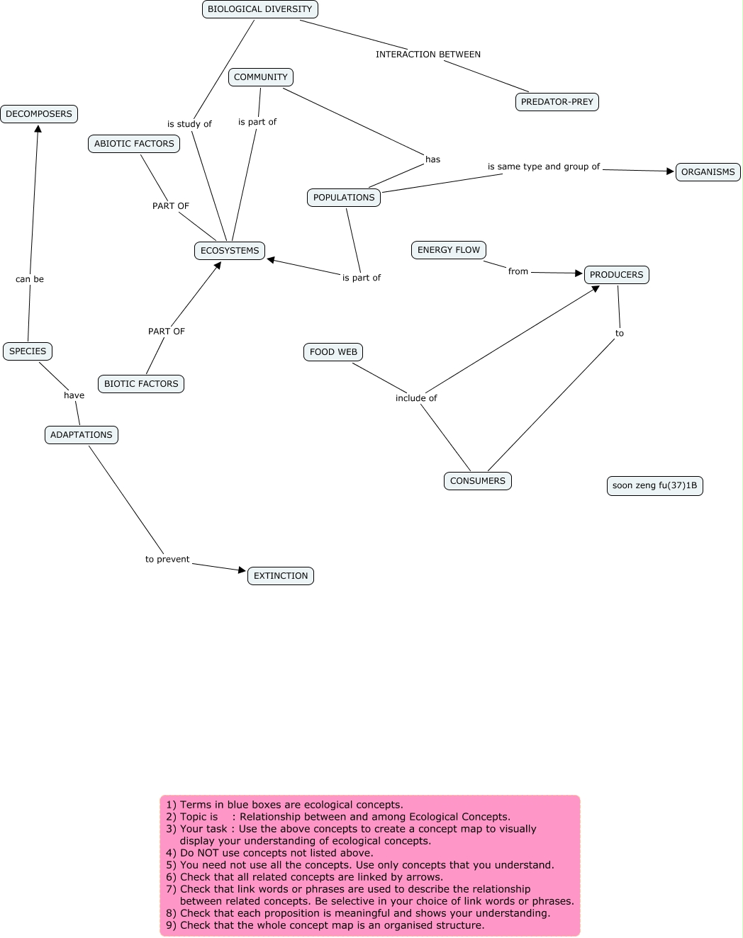 This Concept Map, created with IHMC CmapTools, has information related to: soon zeng fu(37)_ecology_work_1, POPULATIONS is part of ECOSYSTEMS, BIOLOGICAL DIVERSITY is study of ECOSYSTEMS, SPECIES have ADAPTATIONS, ABIOTIC FACTORS PART OF ECOSYSTEMS, FOOD WEB include of PRODUCERS, SPECIES can be DECOMPOSERS, FOOD WEB include of CONSUMERS, COMMUNITY has POPULATIONS, ADAPTATIONS to prevent EXTINCTION, ENERGY FLOW from PRODUCERS, BIOTIC FACTORS PART OF ECOSYSTEMS, POPULATIONS is same type and group of ORGANISMS, PRODUCERS to CONSUMERS, COMMUNITY is part of ECOSYSTEMS, BIOLOGICAL DIVERSITY INTERACTION BETWEEN PREDATOR-PREY
