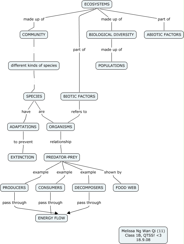 This Concept Map, created with IHMC CmapTools, has information related to: 1B_Melissa Ng (11)_Ecology, ADAPTATIONS to prevent EXTINCTION, SPECIES are ORGANISMS, COMMUNITY different kinds of species, ECOSYSTEMS made up of BIOLOGICAL DIVERSITY, ORGANISMS relationship PREDATOR-PREY, BIOTIC FACTORS refers to ORGANISMS, PREDATOR-PREY example PRODUCERS, ECOSYSTEMS part of ABIOTIC FACTORS, ECOSYSTEMS part of BIOTIC FACTORS, PREDATOR-PREY example DECOMPOSERS, PREDATOR-PREY example CONSUMERS, CONSUMERS pass through ENERGY FLOW, SPECIES have ADAPTATIONS, PREDATOR-PREY shown by FOOD WEB, ECOSYSTEMS made up of COMMUNITY, different kinds of species SPECIES, BIOLOGICAL DIVERSITY made up of POPULATIONS, PRODUCERS pass through ENERGY FLOW, DECOMPOSERS pass through ENERGY FLOW