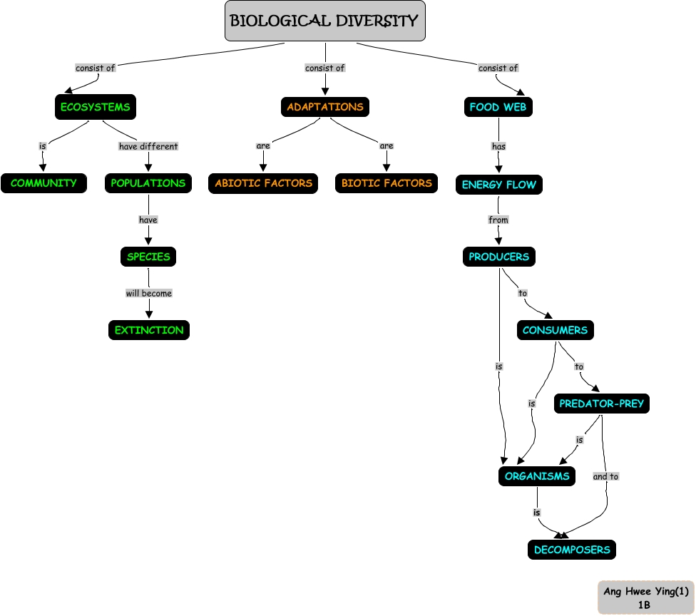This Concept Map, created with IHMC CmapTools, has information related to: anghweeying_1b_01, CONSUMERS to PREDATOR-PREY, BIOLOGICAL DIVERSITY consist of ADAPTATIONS, CONSUMERS is ORGANISMS, BIOLOGICAL DIVERSITY consist of ECOSYSTEMS, PREDATOR-PREY is ORGANISMS, PRODUCERS is ORGANISMS, ORGANISMS is DECOMPOSERS, SPECIES will become EXTINCTION, PRODUCERS to CONSUMERS, ADAPTATIONS are ABIOTIC FACTORS, FOOD WEB has ENERGY FLOW, BIOLOGICAL DIVERSITY consist of FOOD WEB, ADAPTATIONS are BIOTIC FACTORS, ENERGY FLOW from PRODUCERS, POPULATIONS have SPECIES, ECOSYSTEMS have different POPULATIONS, ECOSYSTEMS is COMMUNITY, PREDATOR-PREY and to DECOMPOSERS