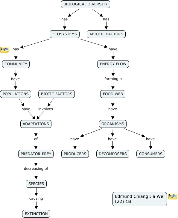 This Concept Map, created with IHMC CmapTools, has information related to: 1B_EdmundChiang_22, SPECIES causing EXTINCTION, ADAPTATIONS of PREDATOR-PREY, ORGANISMS have PRODUCERS, ECOSYSTEMS have ENERGY FLOW, ORGANISMS have DECOMPOSERS, BIOLOGICAL DIVERSITY has ECOSYSTEMS, FOOD WEB have ORGANISMS, ECOSYSTEMS has COMMUNITY, COMMUNITY have POPULATIONS, PREDATOR-PREY decreasing of SPECIES, POPULATIONS have ADAPTATIONS, BIOLOGICAL DIVERSITY has ABIOTIC FACTORS, ORGANISMS have CONSUMERS, BIOTIC FACTORS involves ADAPTATIONS, ENERGY FLOW forming a FOOD WEB