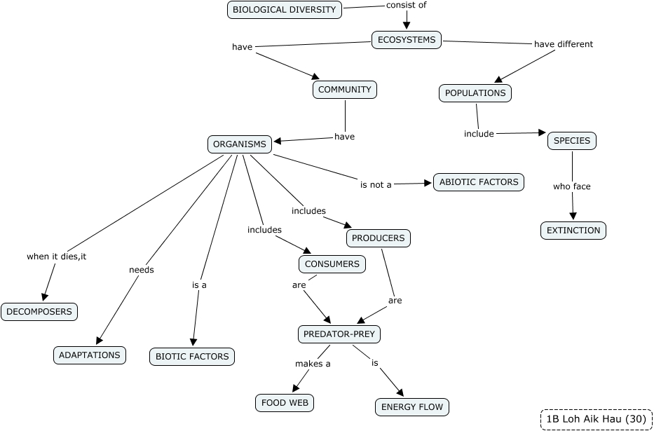 This Concept Map, created with IHMC CmapTools, has information related to: 1B_LohAikHau(30), ORGANISMS is not a ABIOTIC FACTORS, ORGANISMS needs ADAPTATIONS, SPECIES who face EXTINCTION, ECOSYSTEMS have different POPULATIONS, CONSUMERS are PREDATOR-PREY, PREDATOR-PREY is ENERGY FLOW, ORGANISMS when it dies,it DECOMPOSERS, ORGANISMS is a BIOTIC FACTORS, POPULATIONS include SPECIES, PREDATOR-PREY makes a FOOD WEB, BIOLOGICAL DIVERSITY consist of ECOSYSTEMS, COMMUNITY have ORGANISMS, ORGANISMS includes PRODUCERS, ECOSYSTEMS have COMMUNITY, PRODUCERS are PREDATOR-PREY, ORGANISMS includes CONSUMERS