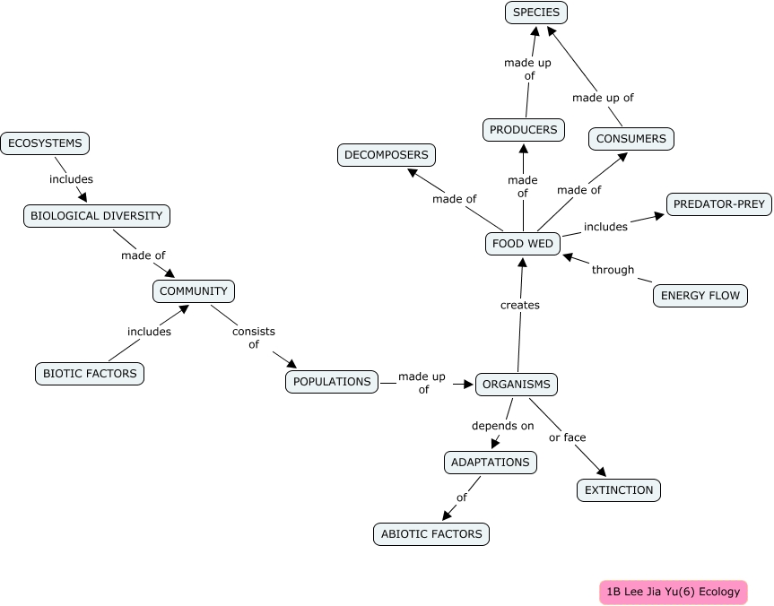 This Concept Map, created with IHMC CmapTools, has information related to: 1B Lee Jia Yu(6) Ecology, BIOTIC FACTORS includes COMMUNITY, PRODUCERS made up of SPECIES, FOOD WED includes PREDATOR-PREY, FOOD WED made of PRODUCERS, ECOSYSTEMS includes BIOLOGICAL DIVERSITY, ORGANISMS or face EXTINCTION, ORGANISMS creates FOOD WED, CONSUMERS made up of SPECIES, ENERGY FLOW through FOOD WED, COMMUNITY consists of POPULATIONS, ADAPTATIONS of ABIOTIC FACTORS, FOOD WED made of DECOMPOSERS, POPULATIONS made up of ORGANISMS, BIOLOGICAL DIVERSITY made of COMMUNITY, FOOD WED made of CONSUMERS, ORGANISMS depends on ADAPTATIONS