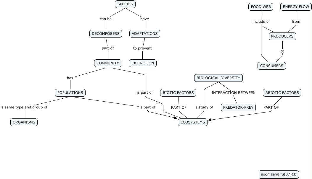 This Concept Map, created with IHMC CmapTools, has information related to: soon zeng fu(37)_ecology_work_2, POPULATIONS is part of ECOSYSTEMS, BIOLOGICAL DIVERSITY is study of ECOSYSTEMS, SPECIES have ADAPTATIONS, ABIOTIC FACTORS PART OF ECOSYSTEMS, FOOD WEB include of PRODUCERS, SPECIES can be DECOMPOSERS, FOOD WEB include of CONSUMERS, COMMUNITY has POPULATIONS, ADAPTATIONS to prevent EXTINCTION, ENERGY FLOW from PRODUCERS, BIOTIC FACTORS PART OF ECOSYSTEMS, POPULATIONS is same type and group of ORGANISMS, PRODUCERS to CONSUMERS, COMMUNITY is part of ECOSYSTEMS, BIOLOGICAL DIVERSITY INTERACTION BETWEEN PREDATOR-PREY, DECOMPOSERS part of COMMUNITY