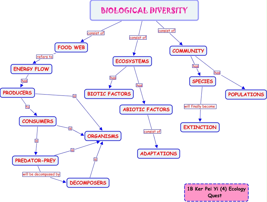 This Concept Map, created with IHMC CmapTools, has information related to: 1B_Ker Peiyi(4), CONSUMERS is ORGANISMS, CONSUMERS is PREDATOR-PREY, ECOSYSTEMS has ABIOTIC FACTORS, BIOLOGICAL DIVERSITY consist of ECOSYSTEMS, BIOLOGICAL DIVERSITY consist of COMMUNITY, ECOSYSTEMS has BIOTIC FACTORS, PRODUCERS to CONSUMERS, PRODUCERS is ORGANISMS, FOOD WEB refers to ENERGY FLOW, COMMUNITY has SPECIES, PREDATOR-PREY will be decomposed by DECOMPOSERS, PREDATOR-PREY is ORGANISMS, ENERGY FLOW has PRODUCERS, BIOLOGICAL DIVERSITY consist of FOOD WEB, COMMUNITY has POPULATIONS, SPECIES will finally become EXTINCTION, ABIOTIC FACTORS consist of ADAPTATIONS, DECOMPOSERS is ORGANISMS