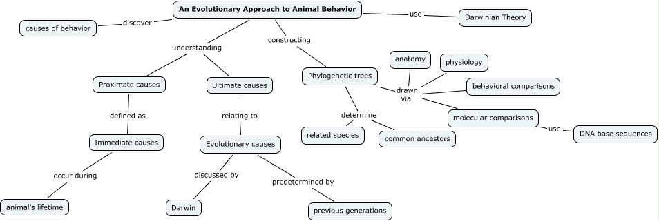 This Concept Map, created with IHMC CmapTools, has information related to: Evolution of behavior preyanka and natalya first, Immediate causes occur during animal's lifetime, An Evolutionary Approach to Animal Behavior understanding Ultimate causes, Phylogenetic trees drawn via molecular comparisons, molecular comparisons use DNA base sequences, Phylogenetic trees drawn via physiology, Phylogenetic trees drawn via behavioral comparisons, An Evolutionary Approach to Animal Behavior use Darwinian Theory, Phylogenetic trees determine common ancestors, Ultimate causes relating to Evolutionary causes, An Evolutionary Approach to Animal Behavior constructing Phylogenetic trees, Evolutionary causes discussed by Darwin, An Evolutionary Approach to Animal Behavior discover causes of behavior, Evolutionary causes predetermined by previous generations, Phylogenetic trees determine related species, An Evolutionary Approach to Animal Behavior understanding Proximate causes, Proximate causes defined as Immediate causes, Phylogenetic trees drawn via anatomy
