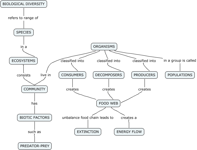 This Concept Map, created with IHMC CmapTools, has information related to: 1D_Darren Lim(28)_ECOLOGY_1, ORGANISMS classified into PRODUCERS, PRODUCERS creates FOOD WEB, ECOSYSTEMS consists COMMUNITY, ORGANISMS in a group is called POPULATIONS, COMMUNITY has BIOTIC FACTORS, SPECIES in a ECOSYSTEMS, FOOD WEB creates a ENERGY FLOW, BIOLOGICAL DIVERSITY refers to range of SPECIES, DECOMPOSERS creates FOOD WEB, ORGANISMS classified into CONSUMERS, BIOTIC FACTORS such as PREDATOR-PREY, ORGANISMS live in COMMUNITY, CONSUMERS creates FOOD WEB, FOOD WEB unbalance food chain leads to EXTINCTION, ORGANISMS classified into DECOMPOSERS
