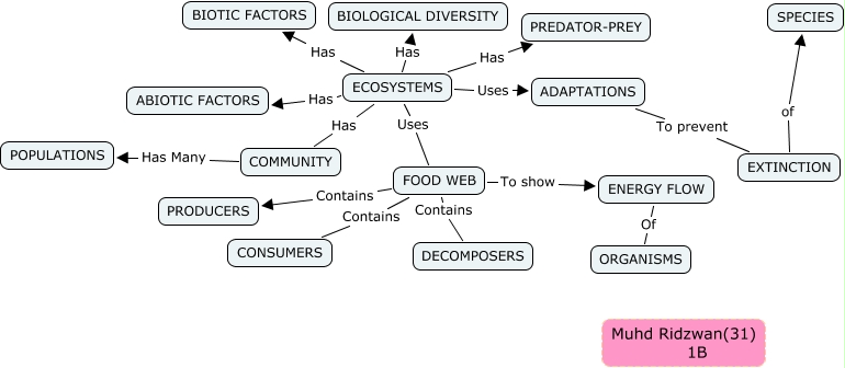 This Concept Map, created with IHMC CmapTools, has information related to: 1b Muhd Ridzwan 31 version 1 not edited without hierchacy, FOOD WEB Contains DECOMPOSERS, ENERGY FLOW Of ORGANISMS, FOOD WEB Contains PRODUCERS, ECOSYSTEMS Uses FOOD WEB, ECOSYSTEMS Has BIOTIC FACTORS, FOOD WEB To show ENERGY FLOW, ECOSYSTEMS Has BIOLOGICAL DIVERSITY, ECOSYSTEMS Has ABIOTIC FACTORS, ADAPTATIONS To prevent EXTINCTION, EXTINCTION of SPECIES, COMMUNITY Has Many POPULATIONS, ECOSYSTEMS Has PREDATOR-PREY, ECOSYSTEMS Uses ADAPTATIONS, ECOSYSTEMS Has COMMUNITY, FOOD WEB Contains CONSUMERS