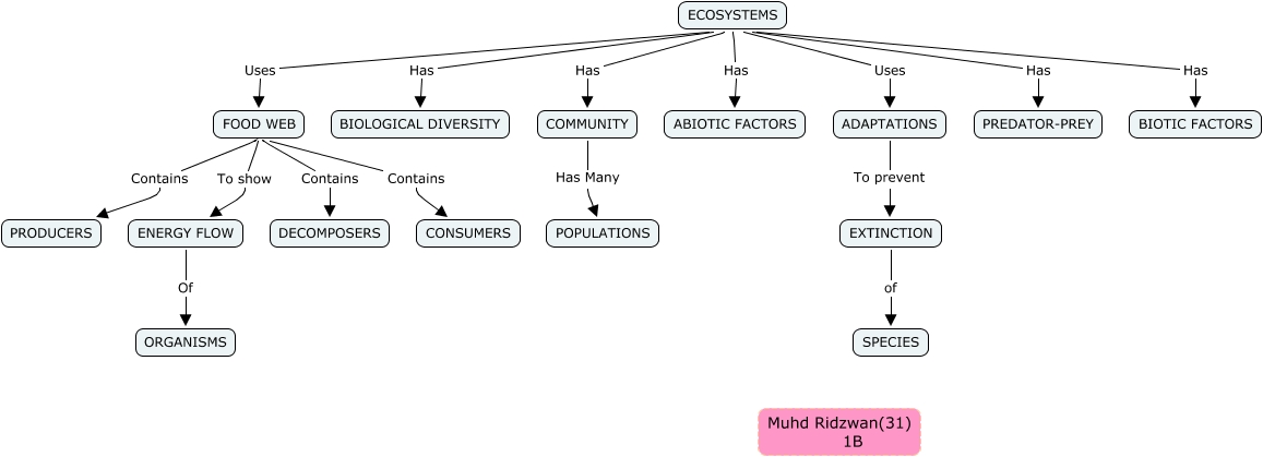 This Concept Map, created with IHMC CmapTools, has information related to: 1b Muhd Ridzwan 31 version 2 edited with hierchacy, FOOD WEB Contains DECOMPOSERS, ENERGY FLOW Of ORGANISMS, FOOD WEB Contains PRODUCERS, ECOSYSTEMS Uses FOOD WEB, ECOSYSTEMS Has BIOTIC FACTORS, FOOD WEB To show ENERGY FLOW, ECOSYSTEMS Has BIOLOGICAL DIVERSITY, ECOSYSTEMS Has ABIOTIC FACTORS, ADAPTATIONS To prevent EXTINCTION, EXTINCTION of SPECIES, COMMUNITY Has Many POPULATIONS, ECOSYSTEMS Has PREDATOR-PREY, ECOSYSTEMS Uses ADAPTATIONS, ECOSYSTEMS Has COMMUNITY, FOOD WEB Contains CONSUMERS