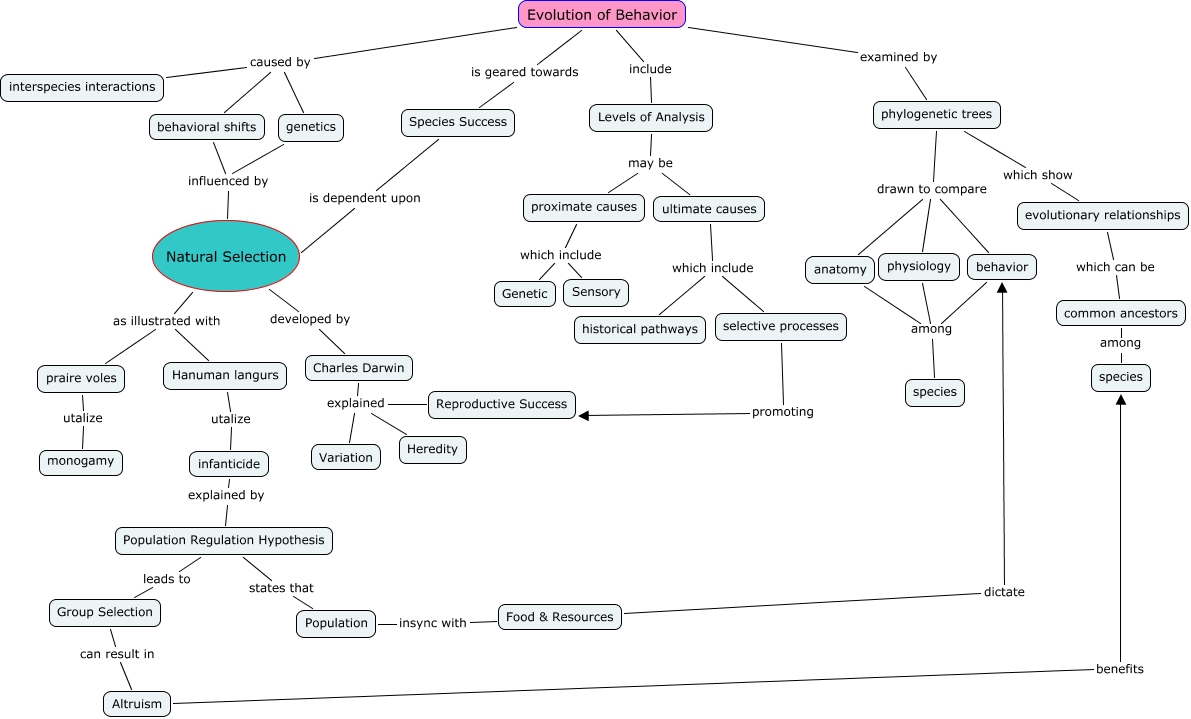 This Concept Map, created with IHMC CmapTools, has information related to: Evolution of Behavior Jenn and Ellyn Final, physiology among species, Natural Selection as illustrated with Hanuman langurs, behavior among species, Altruism benefits species, infanticide explained by Population Regulation Hypothesis, Evolution of Behavior is geared towards Species Success, phylogenetic trees drawn to compare behavior, proximate causes which include Genetic, Evolution of Behavior examined by phylogenetic trees, Natural Selection as illustrated with praire voles, phylogenetic trees drawn to compare physiology, Food & Resources dictate behavior, evolutionary relationships which can be common ancestors, anatomy among species, Levels of Analysis may be proximate causes, praire voles utalize monogamy, proximate causes which include Sensory, phylogenetic trees drawn to compare anatomy, Evolution of Behavior caused by interspecies interactions, Group Selection can result in Altruism
