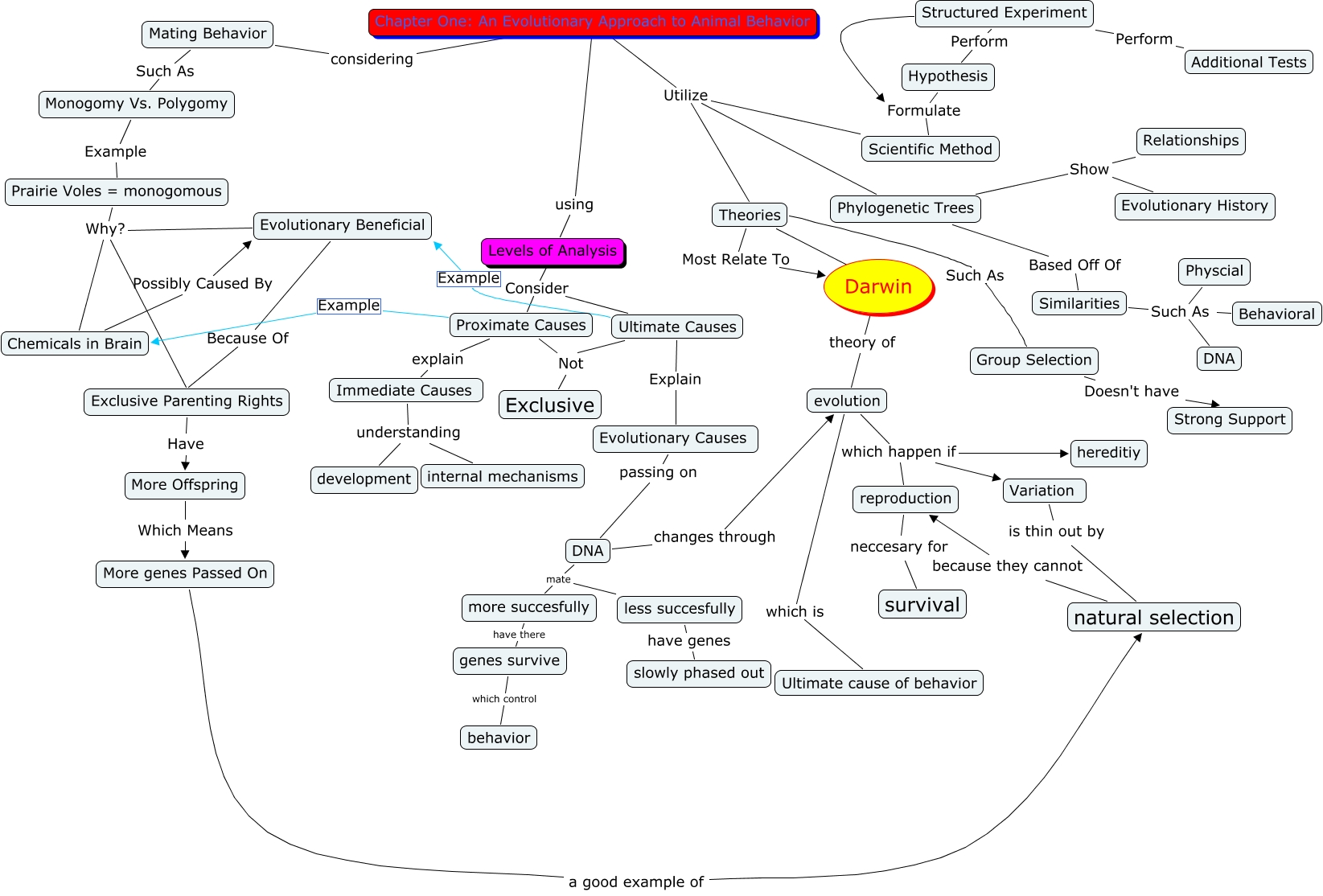 This Concept Map, created with IHMC CmapTools, has information related to: Evolution of Behavior Ken and Tanya Final, Immediate Causes understanding internal mechanisms, Chapter One: An Evolutionary Approach to Animal Behavior Utilize Scientific Method, DNA mate less succesfully, Evolutionary Causes passing on DNA, Ultimate Causes Example Evolutionary Beneficial, Variation is thin out by natural selection, Similarities Such As DNA, Hypothesis Perform Structured Experiment, Prairie Voles = monogomous Why? Chemicals in Brain, Prairie Voles = monogomous Why? Evolutionary Beneficial, Theories Such As Group Selection, Structured Experiment Perform Additional Tests, Structured Experiment Formulate Hypothesis, Ultimate Causes Explain Evolutionary Causes, Similarities Such As Behavioral, Theories Most Relate To Darwin, evolution which happen if Variation, genes survive which control behavior, Proximate Causes Example Chemicals in Brain, More genes Passed On a good example of natural selection