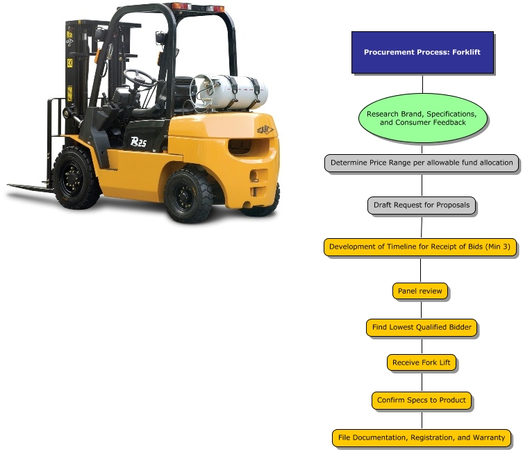 This Concept Map, created with IHMC CmapTools, has information related to: IP530 Finance Functions- Procurement, Draft Request for Proposals Development of Timeline for Receipt of Bids (Min 3), Development of Timeline for Receipt of Bids (Min 3) Panel review, Find Lowest Qualified Bidder Receive Fork Lift, Receive Fork Lift Confirm Specs to Product, Research Brand, Specifications, and Consumer Feedback Determine Price Range per allowable fund allocation, Procurement Process: Forklift Research Brand, Specifications, and Consumer Feedback, Determine Price Range per allowable fund allocation Draft Request for Proposals, Panel review Find Lowest Qualified Bidder, Confirm Specs to Product File Documentation, Registration, and Warranty