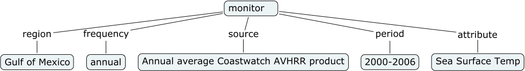 This Concept Map, created with IHMC CmapTools, has information related to: Monitor2, monitor source Annual average Coastwatch AVHRR product, monitor frequency annual, monitor region Gulf of Mexico, monitor attribute Sea Surface Temp, monitor period 2000-2006