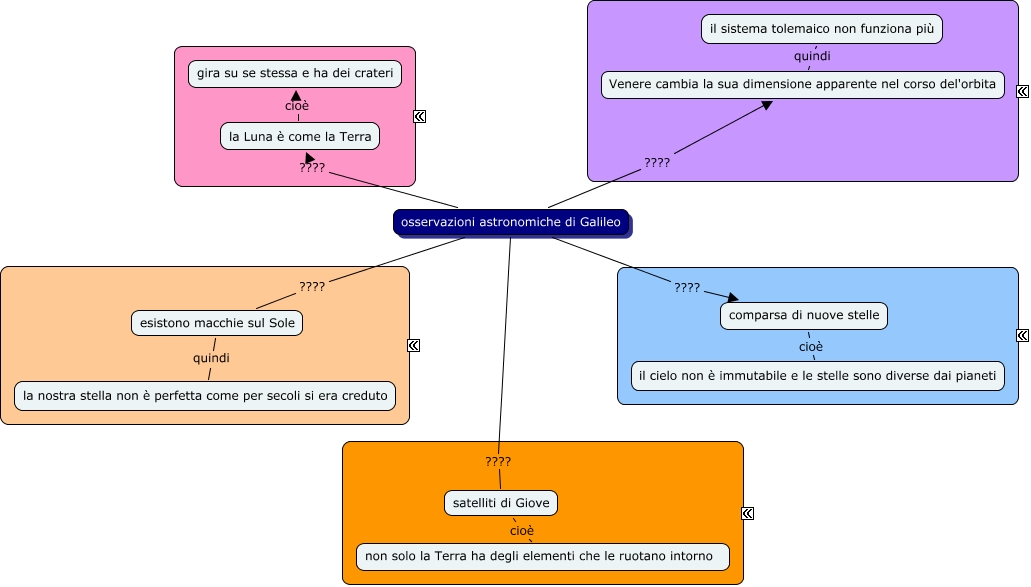 Questa Cmap, creata con IHMC CmapTools, contiene informazioni relative a: osservazioni galileiane, osservazioni astronomiche di Galileo ???? satelliti di Giove, esistono macchie sul Sole quindi la nostra stella non è perfetta come per secoli si era creduto, osservazioni astronomiche di Galileo ???? Venere cambia la sua dimensione apparente nel corso del'orbita, osservazioni astronomiche di Galileo ???? la Luna è come la Terra, osservazioni astronomiche di Galileo ???? comparsa di nuove stelle, comparsa di nuove stelle cioè il cielo non è immutabile e le stelle sono diverse dai pianeti, satelliti di Giove cioè non solo la Terra ha degli elementi che le ruotano intorno, la Luna è come la Terra cioè gira su se stessa e ha dei crateri, Venere cambia la sua dimensione apparente nel corso del'orbita quindi il sistema tolemaico non funziona più, osservazioni astronomiche di Galileo ???? esistono macchie sul Sole