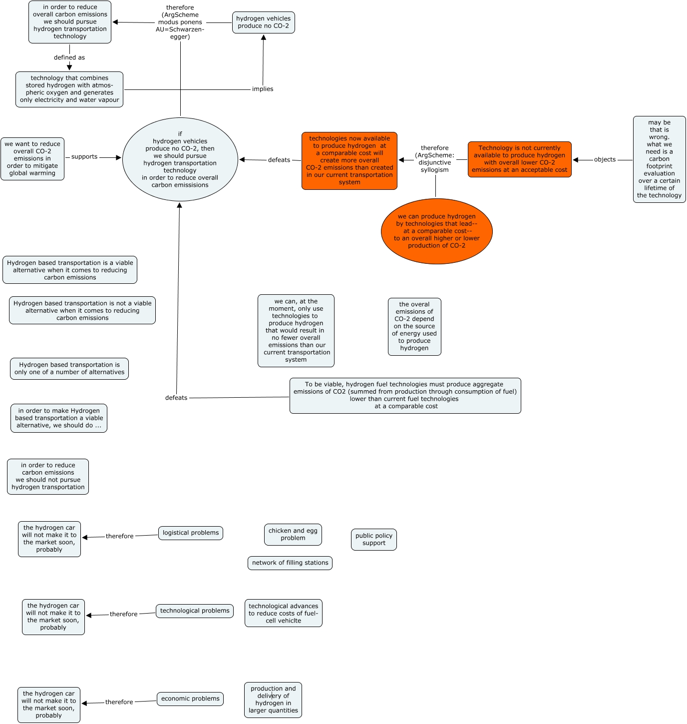 This Concept Map, created with IHMC CmapTools, has information related to: hydrogen car, logistical problems therefore the hydrogen car will not make it to the market soon, probably, technology that combines stored hydrogen with atmos- pheric oxygen and generates only electricity and water vapour implies hydrogen vehicles produce no CO-2, if hydrogen vehicles produce no CO-2, then we should pursue hydrogen transportation technology in order to reduce overall carbon emissisions therefore (ArgScheme modus ponens AU=Schwarzen- egger) in order to reduce overall carbon emissions we should pursue hydrogen transportation technology, hydrogen vehicles produce no CO-2 therefore (ArgScheme modus ponens AU=Schwarzen- egger) in order to reduce overall carbon emissions we should pursue hydrogen transportation technology, To be viable, hydrogen fuel technologies must produce aggregate emissions of CO2 (summed from production through consumption of fuel) lower than current fuel technologies at a comparable cost defeats if hydrogen vehicles produce no CO-2, then we should pursue hydrogen transportation technology in order to reduce overall carbon emissisions, technologies now available to produce hydrogen at a comparable cost will create more overall CO-2 emissions than created in our current transportation system defeats if hydrogen vehicles produce no CO-2, then we should pursue hydrogen transportation technology in order to reduce overall carbon emissisions, we want to reduce overall CO-2 emissions in order to mitigate global warming supports if hydrogen vehicles produce no CO-2, then we should pursue hydrogen transportation technology in order to reduce overall carbon emissisions, technological problems therefore the hydrogen car will not make it to the market soon, probably, may be that is wrong. what we need is a carbon footprint evaluation over a certain lifetime of the technology objects Technology is not currently available to produce hydrogen with overall lower CO-2 emissions at an acceptable cost, Technology is not currently available to produce hydrogen with overall lower CO-2 emissions at an acceptable cost therefore (ArgScheme: disjunctive syllogism technologies now available to produce hydrogen at a comparable cost will create more overall CO-2 emissions than created in our current transportation system, economic problems therefore the hydrogen car will not make it to the market soon, probably, in order to reduce overall carbon emissions we should pursue hydrogen transportation technology defined as technology that combines stored hydrogen with atmos- pheric oxygen and generates only electricity and water vapour, we can produce hydrogen by technologies that lead-- at a comparable cost-- to an overall higher or lower production of CO-2 therefore (ArgScheme: disjunctive syllogism technologies now available to produce hydrogen at a comparable cost will create more overall CO-2 emissions than created in our current transportation system