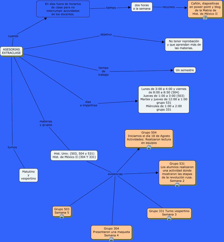 Este Cmap, tiene información relacionada con: ASESORÍAS EXTRACLASE, ASESORIAS EXTRACLASE materias y grupos Hist. Univ. (503, 504 y 531) Hist. de México II (304 Y 331), ASESORIAS EXTRACLASE objetivo No tener reprobación y que aprendan más de las materias., ASESORIAS EXTRACLASE tiempo de trabajo Un semestre, Hist. Univ. (503, 504 y 531) Hist. de México II (304 Y 331) evidencias Grupo 331 Turno vespertino Semana 3, Hist. Univ. (503, 504 y 531) Hist. de México II (304 Y 331) evidencias Grupo 304 Presentaron una maqueta Semana 4, Hist. Univ. (503, 504 y 531) Hist. de México II (304 Y 331) evidencias Grupo 504 Iniciamos el día 18 de Agosto Actividades: Realizaron lectura en equipos, ASESORIAS EXTRACLASE dias a impartirse Lunes de 3:00 a 4:00 y viernes de 8:00 a 8:50 (504) Jueves de 1:00 a 3:00 (503) Martes y jueves de 12:00 a 1:00 grupo 531 Miércoles de 1:00 a 2:00 grupo 331, dos horas a la semana recursos Cañón, diapositivas en power point y blog de la Matria de Hist. de México II, ASESORIAS EXTRACLASE cuando En días fuera de horarios de clase para no interrumpir actividades de los docentes., Hist. Univ. (503, 504 y 531) Hist. de México II (304 Y 331) evidencias Grupo 503 Semana 5, En días fuera de horarios de clase para no interrumpir actividades de los docentes. tiempo dos horas a la semana, Hist. Univ. (503, 504 y 531) Hist. de México II (304 Y 331) evidencias Grupo 531 Los alumnos realizaron una actividad donde mostraron las etapas de la revolución rusa. Semana 2, ASESORIAS EXTRACLASE turnos Matutino y vespertino