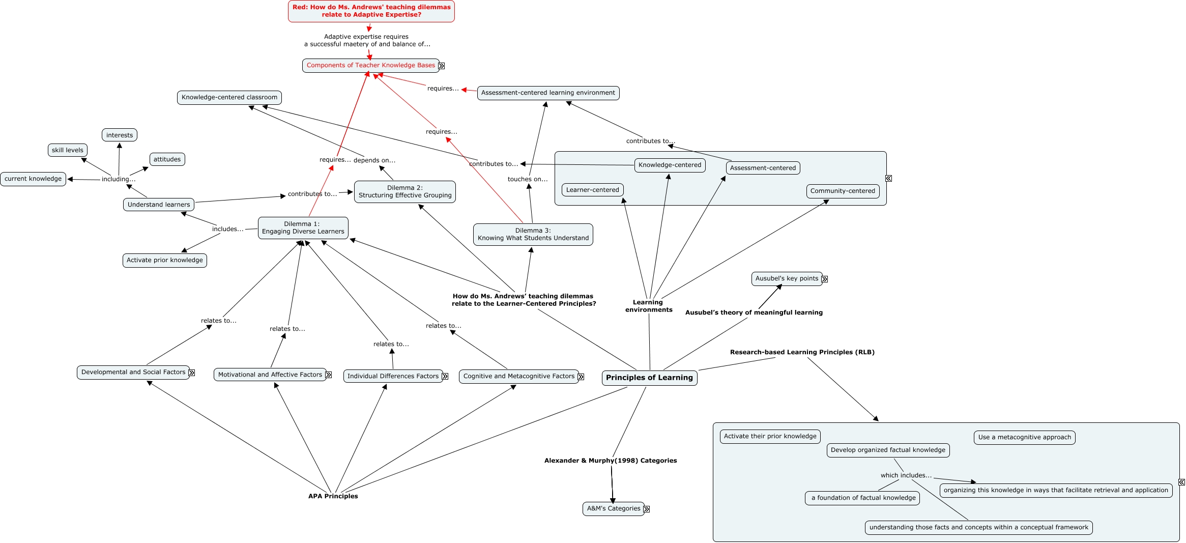 This Concept Map, created with IHMC CmapTools, has information related to: Davis.J.Learner.centered.principles.1, Principles of Learning Alexander & Murphy(1998) Categories 2. Strategic Processing: Self-reflection and regulation essential for learning, Understand learners including... current knowledge, Principles of Learning How do Ms. Andrews’ teaching dilemmas relate to the Learner-Centered Principles? Dilemma 2: Structuring Effective Grouping, Assessment-centered learning environment requires... Components of Teacher Knowledge Bases, Principles of Learning Learning environments Community-centered, Developmental and Social Factors relates to... Dilemma 1: Engaging Diverse Learners, Understand learners including... attitudes, Dilemma 3: Knowing What Students Understand touches on... Assessment-centered learning environment, Understand learners including... skill levels, Red: How do Ms. Andrews' teaching dilemmas relate to Adaptive Expertise? Adaptive expertise requires a successful maetery of and balance of... Kowledge of learners, Cognitive and Metacognitive Factors relates to... Dilemma 1: Engaging Diverse Learners, Dilemma 1: Engaging Diverse Learners includes... Activate prior knowledge, Principles of Learning APA Principles Developmental and Social Factors, Develop organized factual knowledge which includes... understanding those facts and concepts within a conceptual framework, Develop organized factual knowledge which includes... a foundation of factual knowledge, Dilemma 1: Engaging Diverse Learners requires... Knowledge of content, Principles of Learning Alexander & Murphy(1998) Categories 1. Knowledge Base: Serves as a foundation for future learning, Dilemma 3: Knowing What Students Understand requires... Components of Teacher Knowledge Bases, Individual Differences Factors relates to... Dilemma 1: Engaging Diverse Learners, Principles of Learning How do Ms. Andrews’ teaching dilemmas relate to the Learner-Centered Principles? Dilemma 1: Engaging Diverse Learners