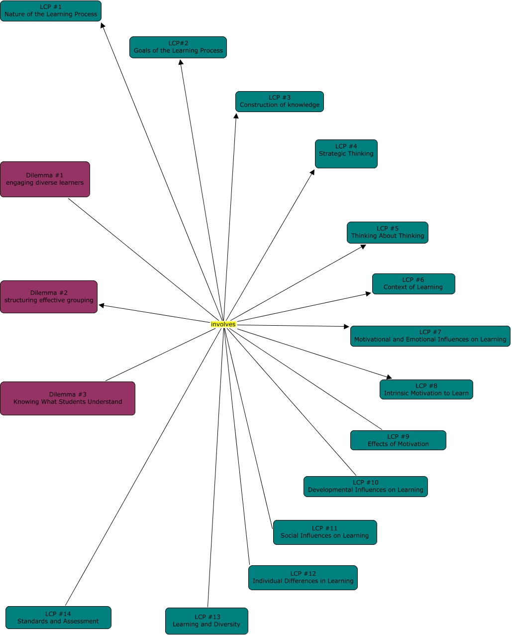 This Concept Map, created with IHMC CmapTools, has information related to: Jonas_Ms. Andrews_1, Dilemma #1 engaging diverse learners involves LCP#2 Goals of the Learning Process, Dilemma #1 engaging diverse learners involves LCP #1 Nature of the Learning Process, Dilemma #1 engaging diverse learners involves LCP #13 Learning and Diversity, Dilemma #1 engaging diverse learners involves LCP #4 Strategic Thinking, Dilemma #1 engaging diverse learners involves LCP #3 Construction of knowledge, Dilemma #1 engaging diverse learners involves LCP #9 Effects of Motivation, Dilemma #1 engaging diverse learners involves LCP #11 Social Influences on Learning, Dilemma #1 engaging diverse learners involves LCP #5 Thinking About Thinking, Dilemma #1 engaging diverse learners involves LCP #6 Context of Learning, Dilemma #1 engaging diverse learners involves LCP #12 Individual Differences in Learning, Dilemma #1 engaging diverse learners involves LCP #8 Intrinsic Motivation to Learn, Dilemma #1 engaging diverse learners involves Dilemma #2 structuring effective grouping, Dilemma #1 engaging diverse learners involves LCP #10 Developmental Influences on Learning, Dilemma #1 engaging diverse learners involves LCP #14 Standards and Assessment, Dilemma #1 engaging diverse learners involves Dilemma #3 Knowing What Students Understand, Dilemma #1 engaging diverse learners involves LCP #7 Motivational and Emotional Influences on Learning