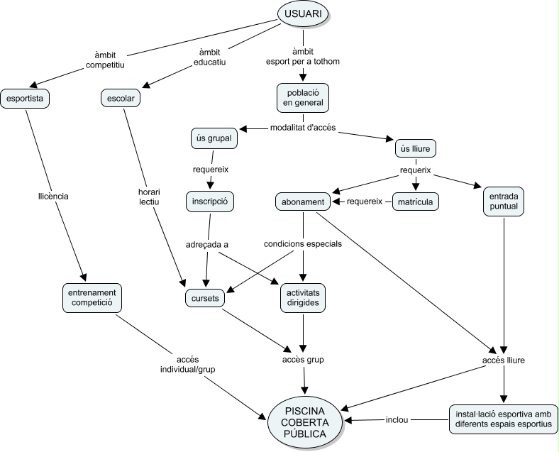 Aquest mapa conceptual conté informació relacionada amb: Accés Piscines Cobertes, matrícula requereix abonament, USUARI àmbit esport per a tothom població en general, inscripció adreçada a cursets, USUARI àmbit educatiu escolar, ús grupal requereix inscripció, abonament accés lliure instal·lació esportiva amb diferents espais esportius, abonament accés lliure PISCINA COBERTA PÚBLICA, escolar horari lectiu cursets, inscripció adreçada a activitats dirigides, abonament condicions especials cursets, cursets accès grup PISCINA COBERTA PÚBLICA, entrada puntual accés lliure PISCINA COBERTA PÚBLICA, esportista llicència entrenament competició, població en general modalitat d'accés ús lliure, instal·lació esportiva amb diferents espais esportius inclou PISCINA COBERTA PÚBLICA, abonament condicions especials activitats dirigides, activitats dirigides accès grup PISCINA COBERTA PÚBLICA, entrenament competició accés individual/grup PISCINA COBERTA PÚBLICA, ús lliure requerix matrícula, població en general modalitat d'accés ús grupal
