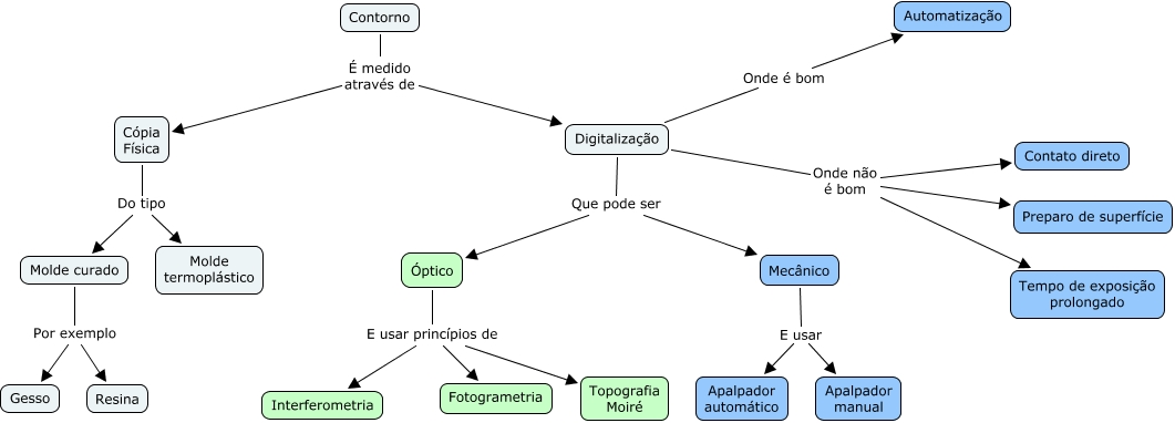 Esse mapa conceitual, produzido no IHMC CmapTools, tem a informação relacionada a: Medição do contorno, Cópia Física Do tipo Molde termoplástico, Óptico E usar princípios de Topografia Moiré, Cópia Física Do tipo Molde curado, Mecânico E usar Apalpador automático, Digitalização Que pode ser Óptico, Digitalização Que pode ser Mecânico, Digitalização Onde é bom Automatização, Mecânico E usar Apalpador manual, Contorno É medido através de Cópia Física, Digitalização Onde não é bom Preparo de superfície, Contorno É medido através de Digitalização, Molde curado Por exemplo Resina, Molde curado Por exemplo Gesso, Óptico E usar princípios de Fotogrametria, Digitalização Onde não é bom Contato direto, Óptico E usar princípios de Interferometria, Digitalização Onde não é bom Tempo de exposição prolongado