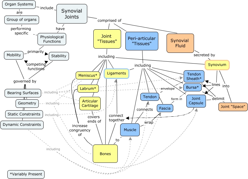 This Concept Map, created with IHMC CmapTools, has information related to: Joint Organ System5, Articular Cartilage covers ends of Bones, Stability governed by Dynamic Constraints, Group of organs performing specific Physiological Functions, Joint "Tissues" including Ligaments, Bearing Surfaces including Labrum*, Synovial Joints comprised of Joint "Tissues", Geometry including Meniscus*, Mobility governed by Dynamic Constraints, Organ Systems include Synovial Joints, Synovium lines Tendon Sheath*, Stability governed by Geometry, Peri-articular "Tissues" including Bursa*, Labrum* increase congruency of Bones, Mobility governed by Geometry, Synovial Joints comprised of Synovial Fluid, Bearing Surfaces including Articular Cartilage, Meniscus* increase congruency of Bones, Joint "Tissues" including Synovium, Joint "Tissues" including Articular Cartilage, Synovium lines Bursa*