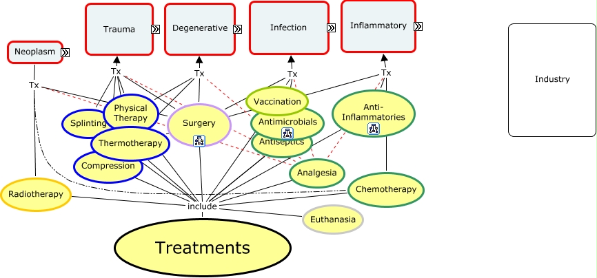 This Concept Map, created with IHMC CmapTools, has information related to: Therapies for swollen joint, Radiotherapy Tx Neoplasm, Treatments include Thermotherapy, Inflammatory including Autoimmune, Treatments include Physical Therapy, Tick-borne Disease e.g. Lyme Disease, Splinting Tx Trauma, Treatments include Antiseptics, Chemotherapy Tx Neoplasm, Treatments include Anti- Inflammatories, Thermotherapy Tx Trauma, Analgesia Tx Degenerative, Treatments include Radiotherapy, Treatments include Vaccination, Antiseptics Tx Infection, Metabolic e.g. Gout, Tick-borne Disease e.g. Ehlichiosis, Infection including Viral/Vaccine, Trauma including Subluxation, Autoimmune e.g. Rheumatoid Arthritis (RA), Anti- Inflammatories Tx Inflammatory