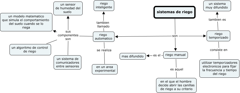 Este Cmap, tiene información relacionada con: okuyama sistemas de riego, sistemas de riego son riego temporizado, sistemas de riego son riego automatico, riego automatico se realiza en un area experimental, sistemas de riego son riego manual, riego automatico sus componentes son un sistema de comunicadores entre sensores, riego automatico sus componentes son un algoritmo de control de riego, riego automatico sus componentes son un sensor de humedad del suelo, riego automatico tambien llamado riego inteligente, riego temporizado tambien es un sistema muy difundido, riego manual es aquel en el que el hombre decide abrir las canillas de riego a su criterio, riego manual es el mas difundido, riego automatico sus componentes son un modelo matematico que simula el comportamiento del suelo cuando se lo riega, riego temporizado consiste en utilizar temporizadores electronicos para fijar la frecuencia y tiempo del riego