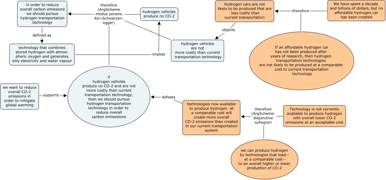 This Concept Map, created with IHMC CmapTools, has information related to: Elise_hydrogen car, Hydrogen cars are not likely to be produced that are less costly than current transportation objects hydrogen vehicles are not more costly than current transportation technology, We have spent a decade and billions of dollars, but no affordable hydrogen car has been created therefore Hydrogen cars are not likely to be produced that are less costly than current transportation, technology that combines stored hydrogen with atmos- pheric oxygen and generates only electricity and water vapour implies hydrogen vehicles produce no CO-2, hydrogen vehicles produce no CO-2 therefore (ArgScheme modus ponens AU=Schwarzen- egger) in order to reduce overall carbon emissions we should pursue hydrogen transportation technology, in order to reduce overall carbon emissions we should pursue hydrogen transportation technology defined as technology that combines stored hydrogen with atmos- pheric oxygen and generates only electricity and water vapour, Technology is not currently available to produce hydrogen with overall lower CO-2 emissions at an acceptable cost therefore (ArgScheme: disjunctive syllogism technologies now available to produce hydrogen at a comparable cost will create more overall CO-2 emissions than created in our current transportation system, hydrogen vehicles are not more costly than current transportation technology therefore (ArgScheme modus ponens AU=Schwarzen- egger) in order to reduce overall carbon emissions we should pursue hydrogen transportation technology, If an affordable hydrogen car has not been produced after years of research, then hydrogen transportation technologies are not likely to be produced at a comparable cost to current transportation technology therefore Hydrogen cars are not likely to be produced that are less costly than current transportation, if hydrogen vehicles produce no CO-2 and are not more costly than current transportation technology, then we should pursue hydrogen transportation technology in order to reduce overall carbon emissisions therefore (ArgScheme modus ponens AU=Schwarzen- egger) in order to reduce overall carbon emissions we should pursue hydrogen transportation technology, technologies now available to produce hydrogen at a comparable cost will create more overall CO-2 emissions than created in our current transportation system defeats if hydrogen vehicles produce no CO-2 and are not more costly than current transportation technology, then we should pursue hydrogen transportation technology in order to reduce overall carbon emissisions, we can produce hydrogen by technologies that lead-- at a comparable cost-- to an overall higher or lower production of CO-2 therefore (ArgScheme: disjunctive syllogism technologies now available to produce hydrogen at a comparable cost will create more overall CO-2 emissions than created in our current transportation system, we want to reduce overall CO-2 emissions in order to mitigate global warming supports if hydrogen vehicles produce no CO-2 and are not more costly than current transportation technology, then we should pursue hydrogen transportation technology in order to reduce overall carbon emissisions