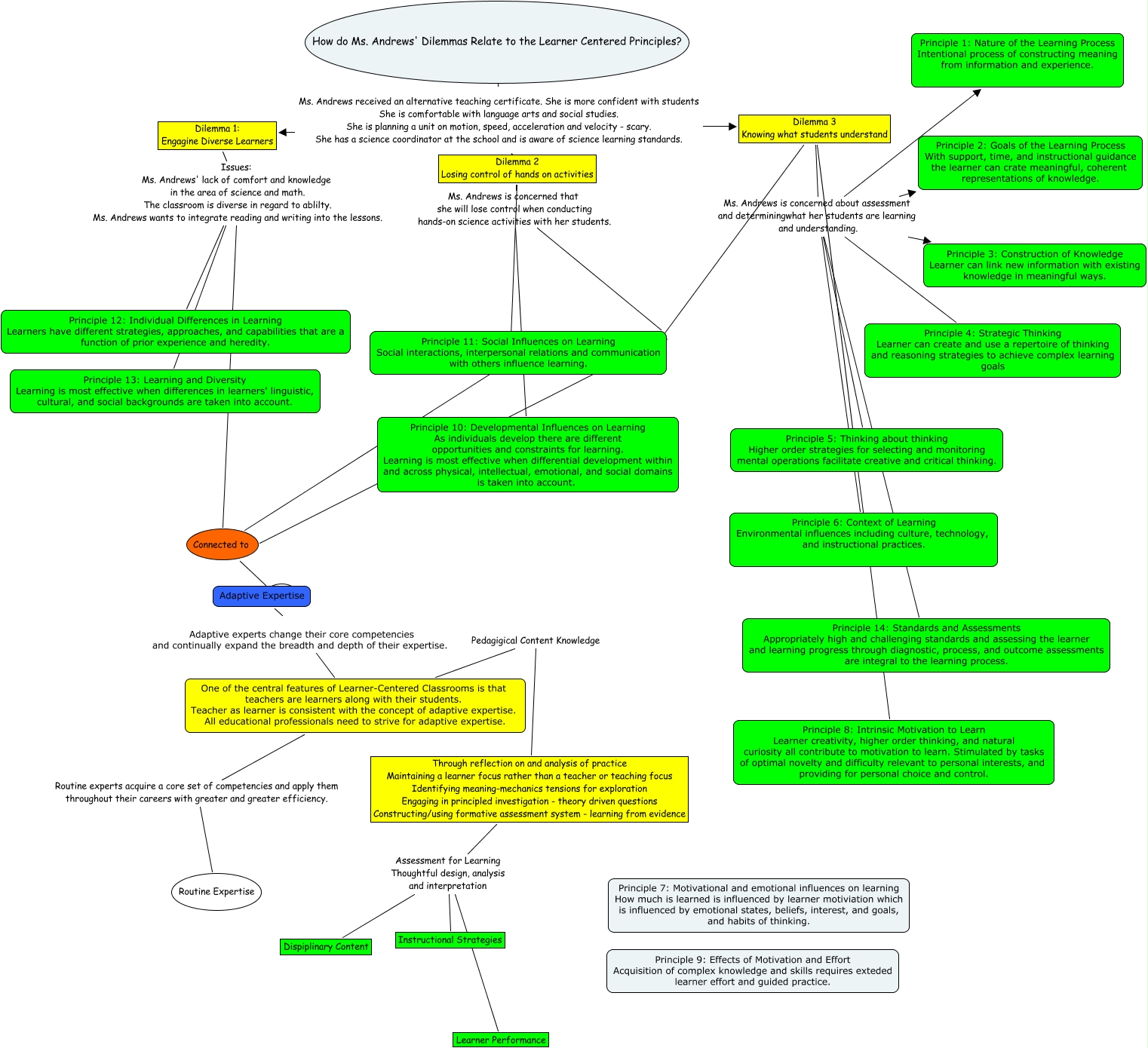 This Concept Map, created with IHMC CmapTools, has information related to: Stella Norman's Module 1 Map 2, Adaptive Expertise Adaptive experts change their core competencies and continually expand the breadth and depth of their expertise. One of the central features of Learner-Centered Classrooms is that teachers are learners along with their students. Teacher as learner is consistent with the concept of adaptive expertise. All educational professionals need to strive for adaptive expertise., Through reflection on and analysis of practice Maintaining a learner focus rather than a teacher or teaching focus Identifying meaning-mechanics tensions for exploration Engaging in principled investigation - theory driven questions Constructing/using formative assessment system - learning from evidence Assessment for Learning Thoughtful design, analysis and interpretation Learner Performance, Dilemma 2 Losing control of hands on activities ???? Connected to, Dilemma 3 Knowing what students understand Ms. Andrews is concerned about assessment and determiningwhat her students are learning and understanding. Principle 14: Standards and Assessments Appropriately high and challenging standards and assessing the learner and learning progress through diagnostic, process, and outcome assessments are integral to the learning process., Dilemma 3 Knowing what students understand Ms. Andrews is concerned about assessment and determiningwhat her students are learning and understanding. Principle 4: Strategic Thinking Learner can create and use a repertoire of thinking and reasoning strategies to achieve complex learning goals, Dilemma 3 Knowing what students understand ???? Connected to, Dilemma 3 Knowing what students understand Ms. Andrews is concerned about assessment and determiningwhat her students are learning and understanding. Principle 1: Nature of the Learning Process Intentional process of constructing meaning from information and experience., Dilemma 3 Knowing what students understand Ms. Andrews is concerned about assessment and determiningwhat her students are learning and understanding. Principle 6: Context of Learning Environmental influences including culture, technology, and instructional practices., Dilemma 3 Knowing what students understand ???? Principle 8: Intrinsic Motivation to Learn Learner creativity, higher order thinking, and natural curiosity all contribute to motivation to learn. Stimulated by tasks of optimal novelty and difficulty relevant to personal interests, and providing for personal choice and control., Dilemma 3 Knowing what students understand Ms. Andrews is concerned about assessment and determiningwhat her students are learning and understanding. Principle 3: Construction of Knowledge Learner can link new information with existing knowledge in meaningful ways., Through reflection on and analysis of practice Maintaining a learner focus rather than a teacher or teaching focus Identifying meaning-mechanics tensions for exploration Engaging in principled investigation - theory driven questions Constructing/using formative assessment system - learning from evidence Assessment for Learning Thoughtful design, analysis and interpretation Dispiplinary Content, Dilemma 1: Engagine Diverse Learners Issues: Ms. Andrews' lack of comfort and knowledge in the area of science and math. The classroom is diverse in regard to ablilty. Ms. Andrews wants to integrate reading and writing into the lessons. Principle 12: Individual Differences in Learning Learners have different strategies, approaches, and capabilities that are a function of prior experience and heredity., How do Ms. Andrews' Dilemmas Relate to the Learner Centered Principles? Ms. Andrews received an alternative teaching certificate. She is more confident with students She is comfortable with language arts and social studies. She is planning a unit on motion, speed, acceleration and velocity - scary. She has a science coordinator at the school and is aware of science learning standards. Dilemma 2 Losing control of hands on activities, One of the central features of Learner-Centered Classrooms is that teachers are learners along with their students. Teacher as learner is consistent with the concept of adaptive expertise. All educational professionals need to strive for adaptive expertise. Pedagigical Content Knowledge Through reflection on and analysis of practice Maintaining a learner focus rather than a teacher or teaching focus Identifying meaning-mechanics tensions for exploration Engaging in principled investigation - theory driven questions Constructing/using formative assessment system - learning from evidence, Dilemma 3 Knowing what students understand Ms. Andrews is concerned about assessment and determiningwhat her students are learning and understanding. Principle 2: Goals of the Learning Process With support, time, and instructional guidance the learner can crate meaningful, coherent representations of knowledge., Dilemma 1: Engagine Diverse Learners Issues: Ms. Andrews' lack of comfort and knowledge in the area of science and math. The classroom is diverse in regard to ablilty. Ms. Andrews wants to integrate reading and writing into the lessons. Connected to, How do Ms. Andrews' Dilemmas Relate to the Learner Centered Principles? Ms. Andrews received an alternative teaching certificate. She is more confident with students She is comfortable with language arts and social studies. She is planning a unit on motion, speed, acceleration and velocity - scary. She has a science coordinator at the school and is aware of science learning standards. Dilemma 1: Engagine Diverse Learners, Dilemma 2 Losing control of hands on activities Ms. Andrews is concerned that she will lose control when conducting hands-on science activities with her students. Principle 10: Developmental Influences on Learning As individuals develop there are different opportunities and constraints for learning. Learning is most effective when differentia