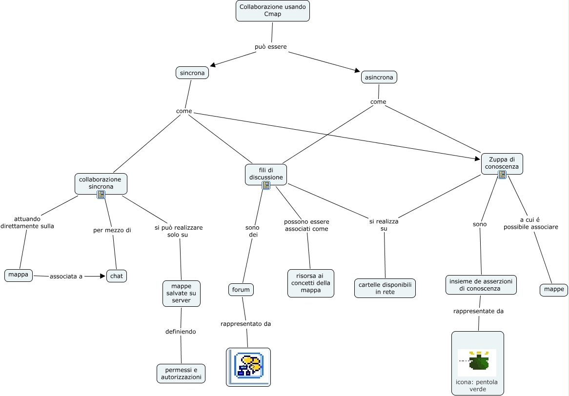 Questa Cmap, creata con IHMC CmapTools, contiene informazioni relative a: Collaborazione con Cmap, sincrona come collaborazione sincrona, fili di discussione possono essere associati come risorsa ai concetti della mappa, insieme de asserzioni di conoscenza rappresentate da icona: pentola verde, sincrona come fili di discussione, forum rappresentato da ????, Zuppa di conoscenza sono insieme de asserzioni di conoscenza, collaborazione sincrona attuando direttamente sulla mappa, collaborazione sincrona per mezzo di chat, Zuppa di conoscenza a cui é possibile associare mappe, Zuppa di conoscenza si realizza su cartelle disponibili in rete, fili di discussione sono dei forum, Collaborazione usando Cmap può essere asincrona, Collaborazione usando Cmap può essere sincrona, sincrona come Zuppa di conoscenza, asincrona come fili di discussione, fili di discussione si realizza su cartelle disponibili in rete, collaborazione sincrona si può realizzare solo su mappe salvate su server, asincrona come Zuppa di conoscenza, mappe salvate su server definiendo permessi e autorizzazioni, mappa associata a chat
