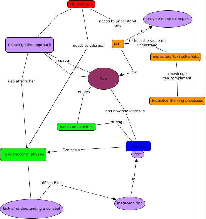 This Concept Map, created with IHMC CmapTools, has information related to: zumpano_eveandandrews2.1, Ms. Andrews needs to understand and plan, Eve enjoys hands on activities, plan for Eve, hands on activities during ????, science Eve has a naive theory of physics, plan to provide many examples, metacognition in ????, Eve ????, plan to help the students understand expository text schemata, Ms. Andrews needs to address ????, Ms. Andrews needs to address ????, Ms. Andrews metacognitive approach, expository text schemata knowledge can compliment inductive thinking processes, lack of understanding a concept affects Eve's metacognition, metacognitive approach also affects her lack of understanding a concept, metacognitive approach impacts ????, Eve and how she learns in science