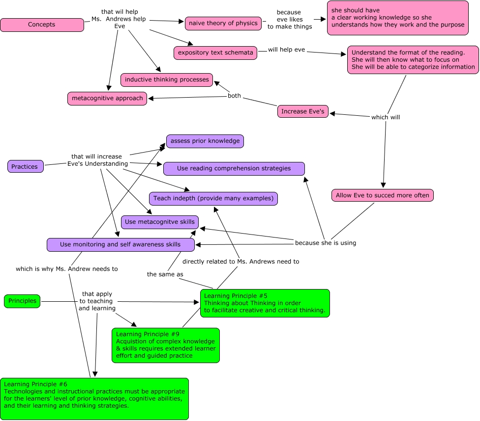 This Concept Map, created with IHMC CmapTools, has information related to: howse_module 2.1, Practices that will increase Eve's Understanding Teach indepth (provide many examples), Learning Principle #6 Technologies and instructional practices must be appropriate for the learners' level of prior knowledge, cognitive abilities, and their learning and thinking strategies. which is why Ms. Andrew needs to assess prior knowledge, Principles that apply to teaching and learning Learning Principle #9 Acquistion of complex knowledge & skills requires extended learner effort and guided practice, Allow Eve to succed more often because she is using Use metacognitve skills, Principles that apply to teaching and learning Learning Principle #6 Technologies and instructional practices must be appropriate for the learners' level of prior knowledge, cognitive abilities, and their learning and thinking strategies., expository text schemata will help eve Understand the format of the reading. She will then know what to focus on She will be able to categorize information, Increase Eve's both metacognitive approach, Understand the format of the reading. She will then know what to focus on She will be able to categorize information which will Increase Eve's, Concepts that wil help Ms. Andrews help Eve metacognitive approach, Principles that apply to teaching and learning Learning Principle #5 Thinking about Thinking in order to facilitate creative and critical thinking., naive theory of physics because eve likes to make things she should have a clear working knowledge so she understands how they work and the purpose, Practices that will increase Eve's Understanding Use monitoring and self awareness skills, Practices that will increase Eve's Understanding Use reading comprehension strategies, Increase Eve's both inductive thinking processes, Learning Principle #9 Acquistion of complex knowledge & skills requires extended learner effort and guided practice directly related to Ms. Andrews need to Teach indepth (provide many examples), Learning Principle #5 Thinking about Thinking in order to facilitate creative and critical thinking. the same as Use metacognitve skills, Concepts that wil help Ms. Andrews help Eve inductive thinking processes, Concepts that wil help Ms. Andrews help Eve naive theory of physics, Practices that will increase Eve's Understanding assess prior knowledge, Understand the format of the reading. She will then know what to focus on She will be able to categorize information which will Allow Eve to succed more often