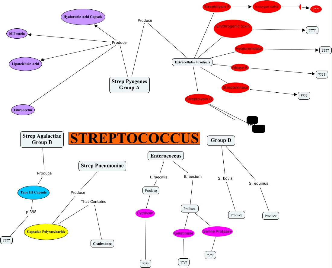 This Concept Map, created with IHMC CmapTools, has information related to: Streptococus, Extracellular Products Streptolysin O, Produce Cytolysin ????, Extracellular Products Streptokinase ????, Extracellular Products Erythrogenic toxin ????, Strep Pyogenes Group A Produce Lipoteichoic Acid, Group D S. bovis Produce, is oxygen stable ????, Strep Pyogenes Group A Produce Fibronectin, Strep Pneumoniae Produce Capsular Polysaccharide, Enterococcus E.faecalis Produce, Extracellular Products DNase B ????, Strep Agalactiae Group B Produce Type III Capsule, Extracellular Products Streptolysin O ????, Extracellular Products Streptolysin S is oxygen stable, Strep Pyogenes Group A Produce Extracellular Products, Type III Capsule p.398 ????, Capsular Polysaccharide That Contains C substance, Enterococcus E.faecium Produce, Group D S. equinus Produce, Strep Pyogenes Group A Produce M Protein