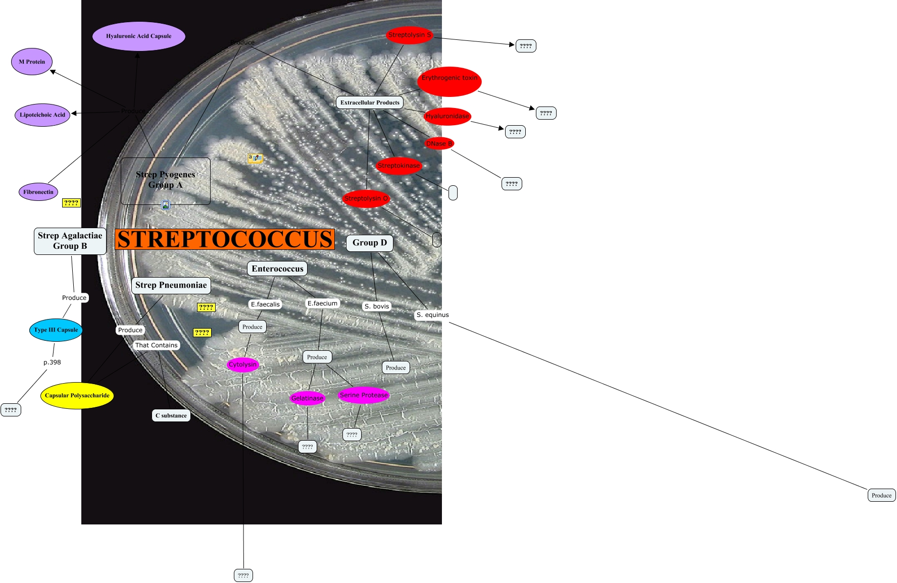 This Concept Map, created with IHMC CmapTools, has information related to: Streptococus(comment), Produce Cytolysin ????, Extracellular Products Streptolysin O, Extracellular Products Streptokinase, Extracellular Products Erythrogenic toxin ????, Strep Pyogenes Group A Produce Lipoteichoic Acid, Group D S. bovis Produce, Strep Pyogenes Group A Produce Fibronectin, Strep Pneumoniae Produce Capsular Polysaccharide, Enterococcus E.faecalis Produce, Extracellular Products DNase B ????, Strep Agalactiae Group B Produce Type III Capsule, Strep Pyogenes Group A Produce Extracellular Products, Type III Capsule p.398 ????, Capsular Polysaccharide That Contains C substance, Extracellular Products Streptolysin S ????, Enterococcus E.faecium Produce, Group D S. equinus Produce, Strep Pyogenes Group A Produce M Protein, Extracellular Products Hyaluronidase ????, Strep Pyogenes Group A Produce Hyaluronic Acid Capsule