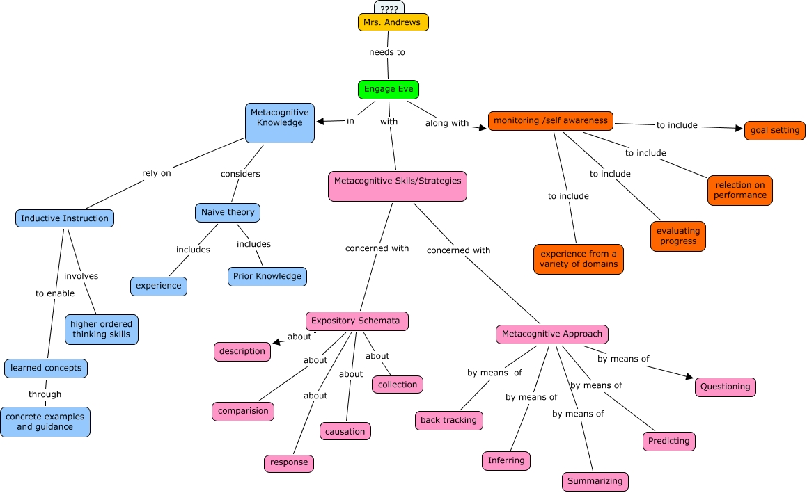 This Concept Map, created with IHMC CmapTools, has information related to: C. Zachary_Eve_2.1, Inductive Instruction to enable learned concepts, Engage Eve in Metacognitive Knowledge, monitoring /self awareness to include experience from a variety of domains, Metacognitive Skils/Strategies concerned with Expository Schemata, Expository Schemata about description, learned concepts through concrete examples and guidance, Expository Schemata about comparision, Expository Schemata about causation, Expository Schemata about response, ???? needs to Engage Eve, monitoring /self awareness to include evaluating progress, Metacognitive Approach by means of back tracking, Engage Eve along with monitoring /self awareness, Engage Eve with Metacognitive Skils/Strategies, Metacognitive Approach by means of Predicting, Expository Schemata about collection, Metacognitive Knowledge rely on Inductive Instruction, Inductive Instruction involves higher ordered thinking skills, monitoring /self awareness to include goal setting, Metacognitive Approach by means of Inferring