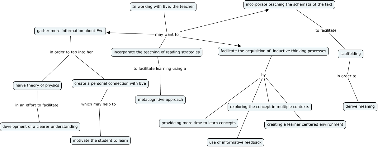 This Concept Map, created with IHMC CmapTools, has information related to: Grissett_Working with Eve, gather more information about Eve in order to tap into her create a personal connection with Eve, In working with Eve, the teacher may want to incorporate teaching the schemata of the text, naive theory of physics in an effort to facilitate development of a clearer understanding, facilitate the acquisition of inductive thinking processes by exploring the concept in multiple contexts, In working with Eve, the teacher may want to gather more information about Eve, facilitate the acquisition of inductive thinking processes by use of informative feedback, incorporate teaching the schemata of the text to facilitate scaffolding, incorparate the teaching of reading strategies to facilitate learning using a metacognitive approach, In working with Eve, the teacher may want to facilitate the acquisition of inductive thinking processes, scaffolding in order to derive meaning, create a personal connection with Eve which may help to motivate the student to learn, In working with Eve, the teacher may want to incorparate the teaching of reading strategies, facilitate the acquisition of inductive thinking processes by creating a learner centered environment, facilitate the acquisition of inductive thinking processes by provideing more time to learn concepts, gather more information about Eve in order to tap into her naive theory of physics