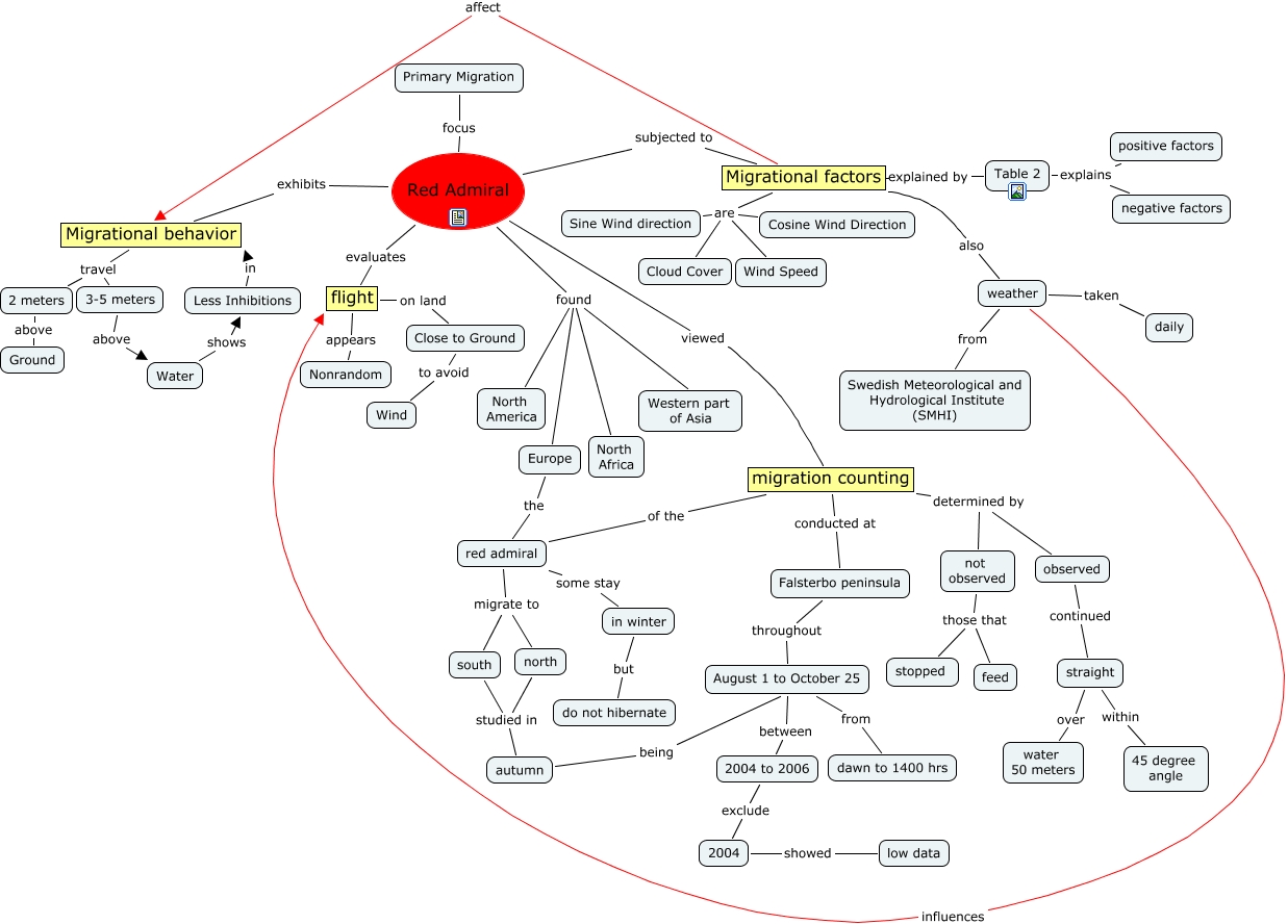 This Concept Map, created with IHMC CmapTools, has information related to: Primary migration First, migration counting conducted at Falsterbo peninsula, 2004 showed low data, Table 2 explains positive factors, Red Admiral subjected to Migrational factors, migration counting of the red admiral, weather influences flight, migration counting determined by observed, Red Admiral viewed migration counting, August 1 to October 25 between 2004 to 2006, Red Admiral evaluates flight, Europe the red admiral, migration counting determined by not observed, in winter but do not hibernate, not observed those that stopped, 2 meters above Ground, Table 2 explains negative factors, not observed those that feed, straight within 45 degree angle, red admiral migrate to south, observed continued straight