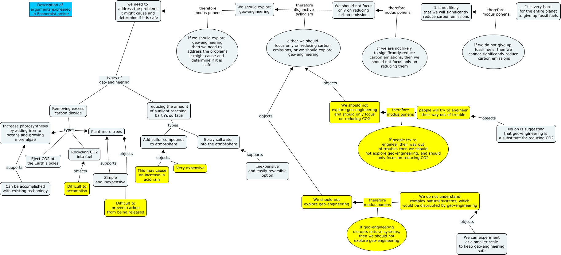 This Concept Map, created with IHMC CmapTools, has information related to: Geo-engineering_Elise, We should not focus only on reducing carbon emissions therefore disjunctive syllogism We should explore geo-engineering, Simple and inexpensive supports Plant more trees, We should explore geo-engineering therefore modus ponens we need to address the problems it might cause and determine if it is safe, It is very hard for the entire planet to give up fossil fuels therefore modus ponens It is not likely that we will significantly reduce carbon emissions, Removing excess carbon dioxide types Recycling CO2 into fuel, Can be accomplished with existing technology supports Increase photosynthesis by adding iron to oceans and growing more algae, Very expensive objects Add sulfur compounds to atmosphere, Removing excess carbon dioxide types Eject CO2 at the Earth's poles, This may cause an increase in acid rain objects Add sulfur compounds to atmosphere, We can experiment at a smaller scale to keep geo-engineering safe objects We do not understand complex natural systems, which would be disprupted by geo-engineering, It is not likely that we will significantly reduce carbon emissions therefore modus ponens We should not focus only on reducing carbon emissions, Difficult to accomplish objects Recycling CO2 into fuel, Difficult to prevent carbon from being released objects Plant more trees, If we do not give up fossil fuels, then we cannot significantly reduce carbon emissions therefore modus ponens It is not likely that we will significantly reduce carbon emissions, No on is suggesting that geo-engineering is a substitute for reducing CO2 objects people will try to engineer their way out of trouble, reducing the amount of sunlight reaching Earth's surface types Add sulfur compounds to atmosphere, We do not understand complex natural systems, which would be disprupted by geo-engineering therefore modus ponens We should not explore geo-engineering, we need to address the problems it might cause and determine if it is safe types of geo-engineering reducing the amount of sunlight reaching Earth's surface, people will try to engineer their way out of trouble therefore modus ponens We should not explore geo-engineering and should only focus on reducing CO2, We should not explore geo-engineering and should only focus on reducing CO2 objects either we should focus only on reducing carbon emissions, or we should explore geo-engineering