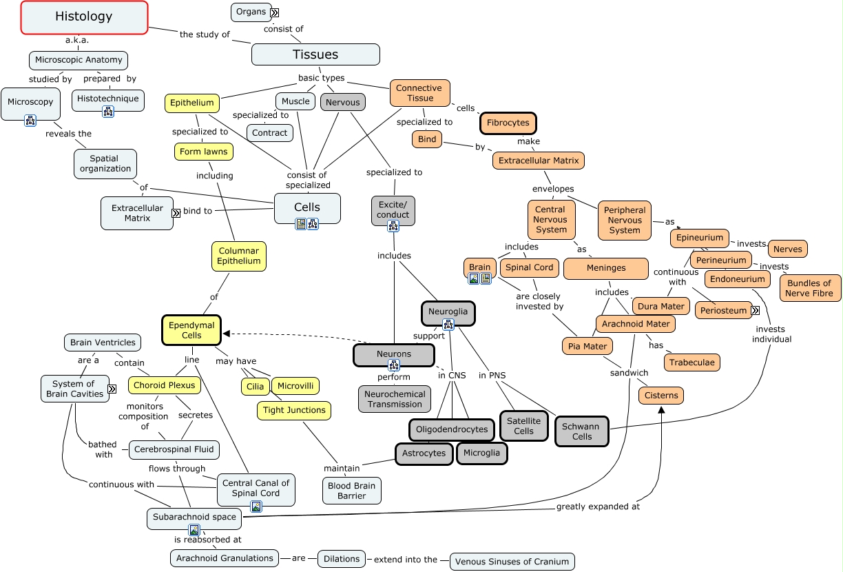 This Concept Map, created with IHMC CmapTools, has information related to: Nervous System Tissues and Cells, Microscopic Anatomy studied by Microscopy, Cerebral Aquaduct (of Sylvius) with Fourth Ventricle, Cerebral Hemispheres of Forebrain, System of Cavities including Third Ventricle, Third Ventricle of Midbrain, Lateral Ventricles bilaterally in Cerebral Hemispheres, Nervous consist of specialized Cells, Unicellular topic of Microbiology, Central Nervous System includes Brain, Arachnoid Mater sandwich Cisterns, Neuroglia in CNS Oligodendrocytes, Neurons perform Neurochemical Transmission, Connective Tissue cells Fibrocytes, Pia Mater are closely invested by Brain, Epithelium specialized to Form lawns, Choroid Plexus secretes Cerebrospinal Fluid, Epineurium continuous with Periosteum, Tissues basic types Epithelium, Periosteum of Vertebral Column, System of Brain Cavities continuous with Central Canal of Spinal Cord