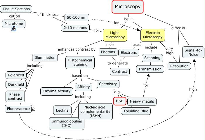 This Concept Map, created with IHMC CmapTools, has information related to: Microscopy1, Light Microscopy uses Photons, Chemistry e.g. Toluidine Blue, Illumination including Fluorescence, Photons to generate Contrast, Microscopy differ in Resolution, Electron Microscopy include Transmission, Fluorescence e.g. Widefield, Chemistry e.g. Heavy metals, Fluorescence e.g. Confocal, Affinity including Immunoglobulins (IHC), Illumination including Darkfield, Affinity including Nucleic acid complementarity (ISHH), Heavy metals for Transmission, Microscopy types Electron Microscopy, Histochemical staining based on Chemistry, Microscopy types Light Microscopy, Chemistry e.g. H&E, Electrons to generate Contrast, Tissue Sections of thickness 50-100 nm, Histochemical staining based on Affinity