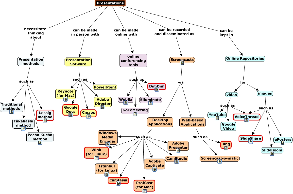 This Concept Map, created with IHMC CmapTools, has information related to: Show and Tell, Desktop Applications such as Wink (for Linux), images such as VoiceThread, Presentations necessitate thinking about Presentation methods, online conferencing tools such as DimDim, Desktop Applications such as Camtasia, Presentation Sotware such as PowerPoint, Presentations can be made online with online conferencing tools, Screencasts via Desktop Applications, video such as VoiceThread, Presentation Sotware such as Google Docs, Presentation methods such as Lessig method, Web-based Applications such as Jing, Presentation Sotware such as Adobe Director, Desktop Applications such as ProfCast (for Mac), images such as SlideBoom, video such as Google Video, Presentation methods such as Takahashi method, Presentations can be recorded and disseminated as Screencasts, Online Repositories for video, video such as YouTube