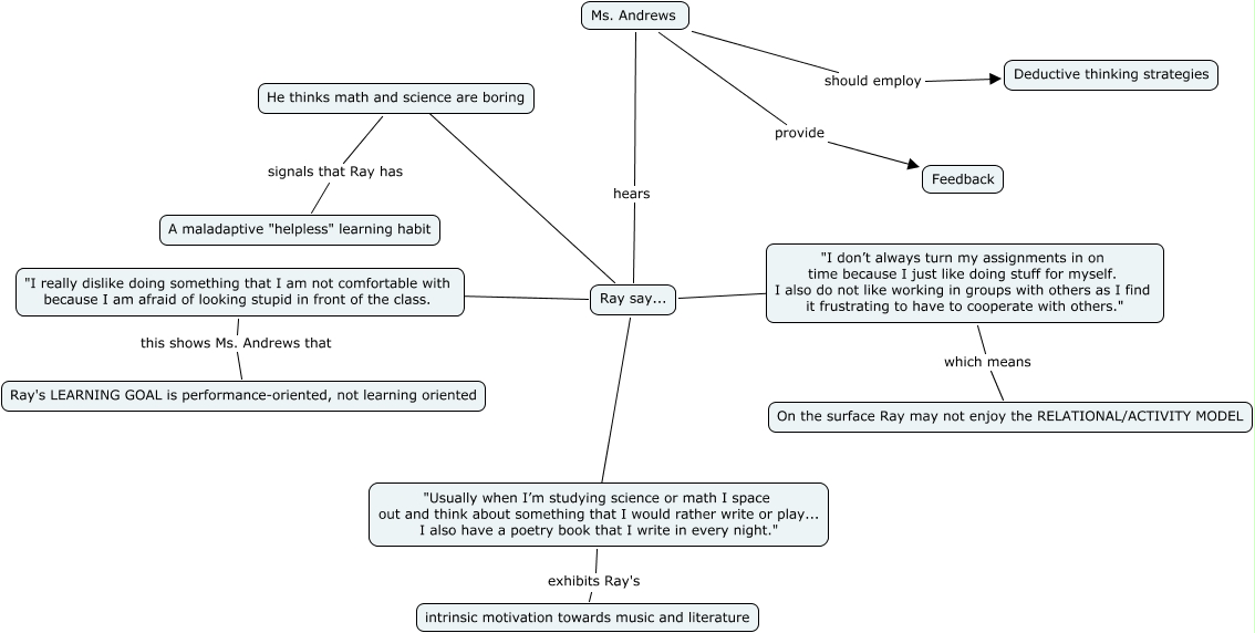 This Concept Map, created with IHMC CmapTools, has information related to: Nelson_Ray_Module 2.2, "I don’t always turn my assignments in on time because I just like doing stuff for myself. I also do not like working in groups with others as I find it frustrating to have to cooperate with others." which means On the surface Ray may not enjoy the RELATIONAL/ACTIVITY MODEL, Ms. Andrews hears Ray say..., Ms. Andrews provide Feedback, "I really dislike doing something that I am not comfortable with because I am afraid of looking stupid in front of the class. this shows Ms. Andrews that Ray's LEARNING GOAL is performance-oriented, not learning oriented, Ms. Andrews should employ Deductive thinking strategies, He thinks math and science are boring signals that Ray has A maladaptive "helpless" learning habit, "Usually when I’m studying science or math I space out and think about something that I would rather write or play... I also have a poetry book that I write in every night." exhibits Ray's intrinsic motivation towards music and literature, Ray say... ???? "I really dislike doing something that I am not comfortable with because I am afraid of looking stupid in front of the class., Ray say... ???? "Usually when I’m studying science or math I space out and think about something that I would rather write or play... I also have a poetry book that I write in every night.", Ray say... ???? He thinks math and science are boring, Ray say... ???? "I don’t always turn my assignments in on time because I just like doing stuff for myself. I also do not like working in groups with others as I find it frustrating to have to cooperate with others."