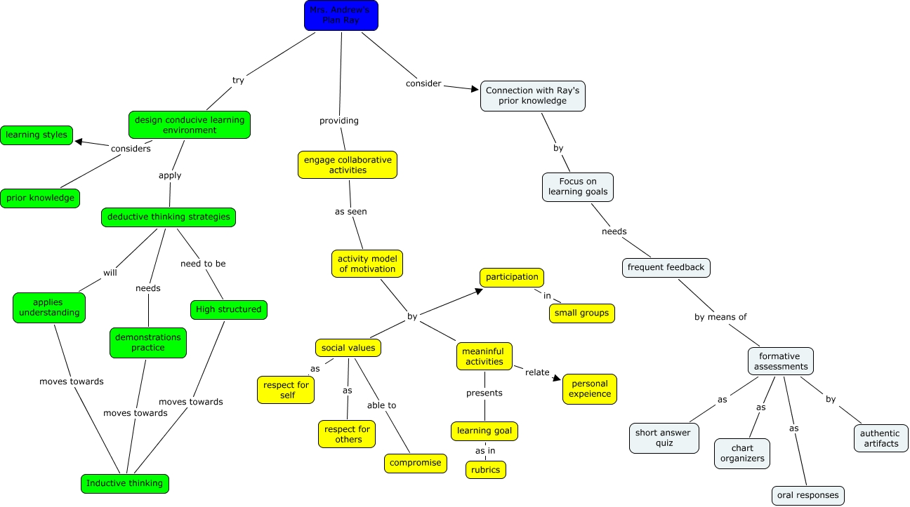 This Concept Map, created with IHMC CmapTools, has information related to: C. Zachary_Ray_2.2, formative assessments as oral responses, learning goal as in rubrics, High structured moves towards Inductive thinking, meaninful activities presents learning goal, meaninful activities relate personal expeience, activity model of motivation by social values, Connection with Ray's prior knowledge by Focus on learning goals, formative assessments by authentic artifacts, frequent feedback by means of formative assessments, design conducive learning environment apply deductive thinking strategies, formative assessments as chart organizers, deductive thinking strategies need to be High structured, Focus on learning goals needs frequent feedback, social values as respect for others, Mrs. Andrew's Plan Ray consider Connection with Ray's prior knowledge, activity model of motivation by participation, design conducive learning environment considers learning styles, social values as respect for self, social values able to compromise, engage collaborative activities as seen activity model of motivation