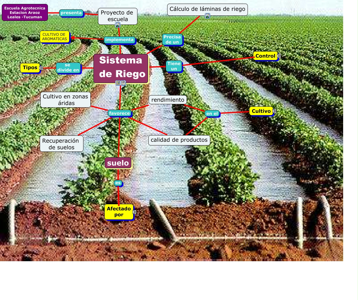 Este mapa conceptual tiene información relacionada a: SistemaRiego, Sistema de Riego Precisa de un Cálculo de láminas de riego, suelo es métodos inadecuados de cultivo, suelo es salinización, Sistema de Riego favorece calidad de productos, Tipos son Inundación, Sistema de Riego favorece suelo, Cultivo en zonas áridas favorece rendimiento, control Referente humedad del suelo, en linea zanahoria caña de azucar El cultivo puede ser Monte frutal, Cultivo en zonas áridas favorece Recuperación de suelos