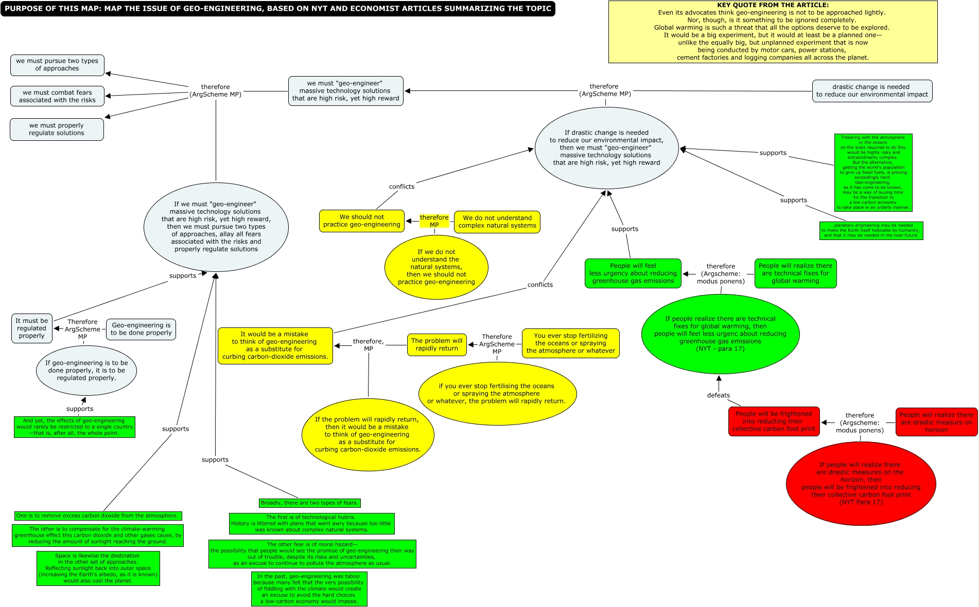This Concept Map, created with IHMC CmapTools, has information related to: geo engineering benv2, It must be regulated properly supports If we must "geo-engineer" massive technology solutions that are high risk, yet high reward, then we must pursue two types of approaches, allay all fears associated with the risks and properly regulate solutions, You ever stop fertilizing the oceans or spraying the atmosphere or whatever Therefore ArgScheme MP The problem will rapidly return, we must "geo-engineer" massive technology solutions that are high risk, yet high reward therefore (ArgScheme MP) we must pursue two types of approaches, If we must "geo-engineer" massive technology solutions that are high risk, yet high reward, then we must pursue two types of approaches, allay all fears associated with the risks and properly regulate solutions therefore (ArgScheme MP) we must pursue two types of approaches, If drastic change is needed to reduce our environmental impact, then we must "geo-engineer" massive technology solutions that are high risk, yet high reward therefore (ArgScheme MP) we must "geo-engineer" massive technology solutions that are high risk, yet high reward, If we do not understand the natural systems, then we should not practice geo-engineering therefore MP We should not practice geo-engineering, drastic change is needed to reduce our environmental impact therefore (ArgScheme MP) we must "geo-engineer" massive technology solutions that are high risk, yet high reward, We do not understand complex natural systems therefore MP We should not practice geo-engineering, People will feel less urgency about reducing greenhouse gas emissions supports If drastic change is needed to reduce our environmental impact, then we must "geo-engineer" massive technology solutions that are high risk, yet high reward, we must "geo-engineer" massive technology solutions that are high risk, yet high reward therefore (ArgScheme MP) we must properly regulate solutions, And yet, the effects of geo-engineering would rarely be restricted to a single country —that is, after all, the whole point. supports If geo-engineering is to be done properly, it is to be regulated properly., Tinkering with the atmosphere or the oceans on the scale required to do this would be highly risky and extraordinarily complex. But the alternative, getting the world’s population to give up fossil fuels, is proving exceedingly hard. Geo-engineering, as it has come to be known, may be a way of buying time for the transition to a low-carbon economy to take place in an orderly manner. supports If drastic change is needed to reduce our environmental impact, then we must "geo-engineer" massive technology solutions that are high risk, yet high reward, If we must "geo-engineer" massive technology solutions that are high risk, yet high reward, then we must pursue two types of approaches, allay all fears associated with the risks and properly regulate solutions therefore (ArgScheme MP) we must properly regulate solutions, One is to remove excess carbon dioxide from the atmosphere. supports If we must "geo-engineer" massive technology solutions that are high risk, yet high reward, then we must pursue two types of approaches, allay all fears associated with the risks and properly regulate solutions, We should not practice geo-engineering conflicts If drastic change is needed to reduce our environmental impact, then we must "geo-engineer" massive technology solutions that are high risk, yet high reward, If we must "geo-engineer" massive technology solutions that are high risk, yet high reward, then we must pursue two types of approaches, allay all fears associated with the risks and properly regulate solutions therefore (ArgScheme MP) we must combat fears associated with the risks, Broadly, there are two types of fears. supports If we must "geo-engineer" massive technology solutions that are high risk, yet high reward, then we must pursue two types of approaches, allay all fears associated with the risks and properly regulate solutions, ...planetary engineering may be needed to make the Earth itself habitable by humanity, and that it may be needed in the near future. supports If drastic change is needed to reduce our environmental impact, then we must "geo-engineer" massive technology solutions that are high risk, yet high reward, Geo-engineering is to be done properly Therefore ArgScheme MP It must be regulated properly, People will realize there are technical fixes for global warming therefore (Argscheme: modus ponens) People will feel less urgency about reducing greenhouse gas emissions