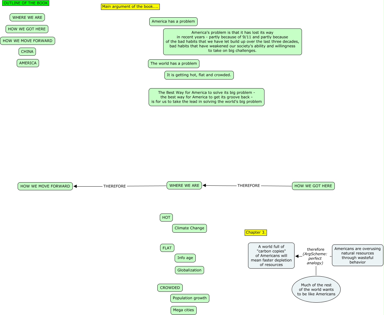 This Concept Map has information related to: TermProject arg3HFC, WHERE WE ARE THEREFORE HOW WE MOVE FORWARD, HOW WE GOT HERE THEREFORE WHERE WE ARE, Americans are overusing natural resources through wasteful behavior therefore (ArgScheme: perfect analogy) A world full of "carbon copies" of Americans will mean faster depletion of resources, Much of the rest of the world wants to be like Americans therefore (ArgScheme: perfect analogy) A world full of "carbon copies" of Americans will mean faster depletion of resources